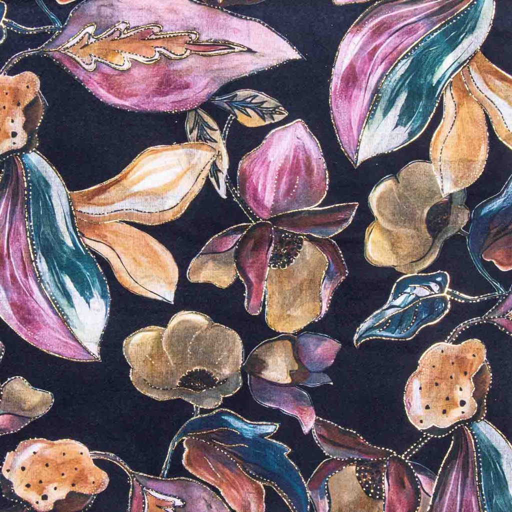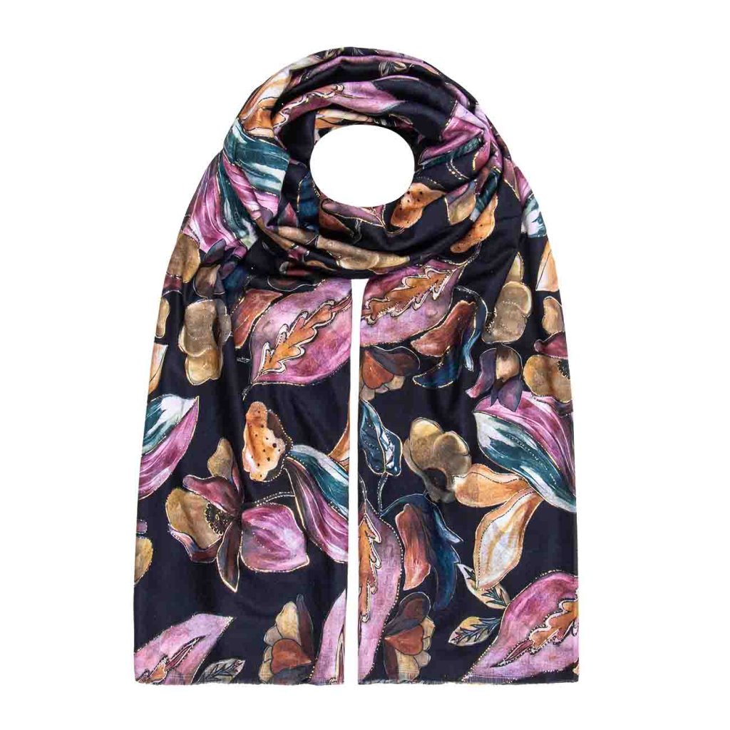 Feltűnő fekete kendő virágmintával rózsaszín árnyalatokban és luxus arany nyomattal. Remek választás esti kombinációkhoz és mindennapi viselethez.