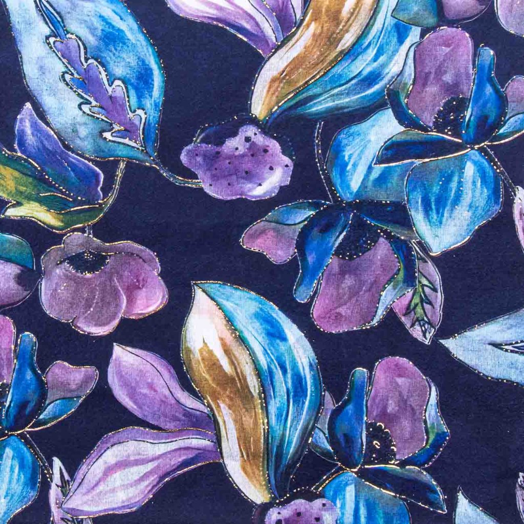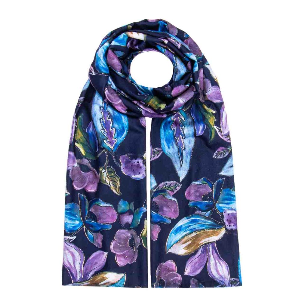 A sötétkék sál lila-kék virágokkal és finom arany nyomattal gyönyörűen mutat az elegáns öltözékekhez. A meleg anyag kényelmet biztosít a zord időben.
