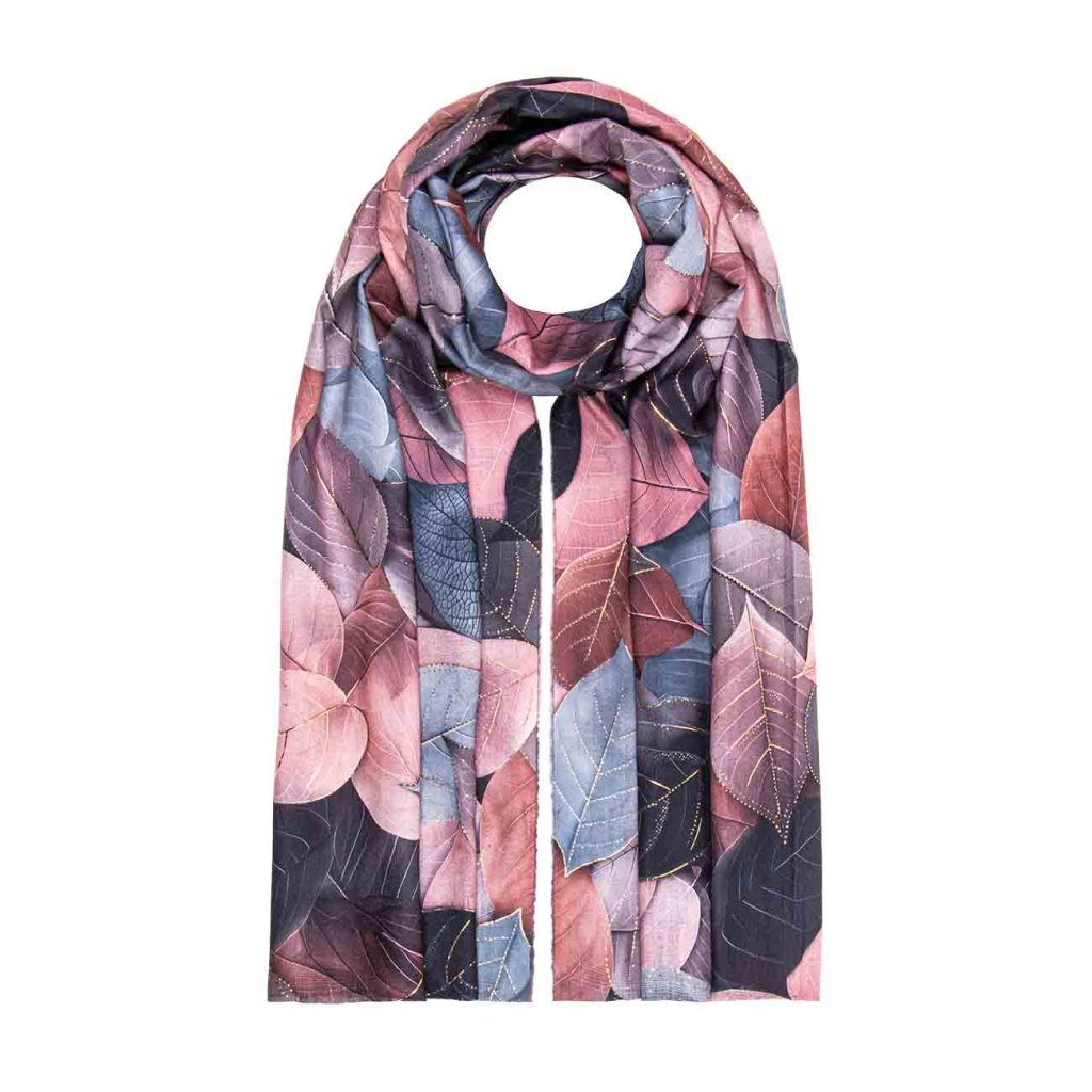 Elegáns sál rózsaszín és szürke árnyalatok kombinációjával, finom levélmintával. A diszkrét aranynyomat az egyik oldalon luxus megjelenést és finom csillogást kölcsönöz, amely gyönyörűen kiemelkedik viselés közben. Ideális kiegészítő őszi és téli napokra egyaránt.