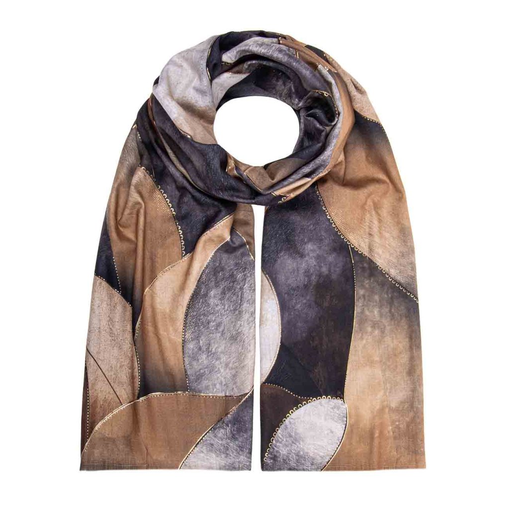 Elegáns sál bézs, barna és fekete természetes árnyalatokban. Az arany nyomatnak köszönhetően ünnepélyes, ugyanakkor visszafogott hatást kelt. Remekül illik a semleges és a feltűnő ruhákhoz is.