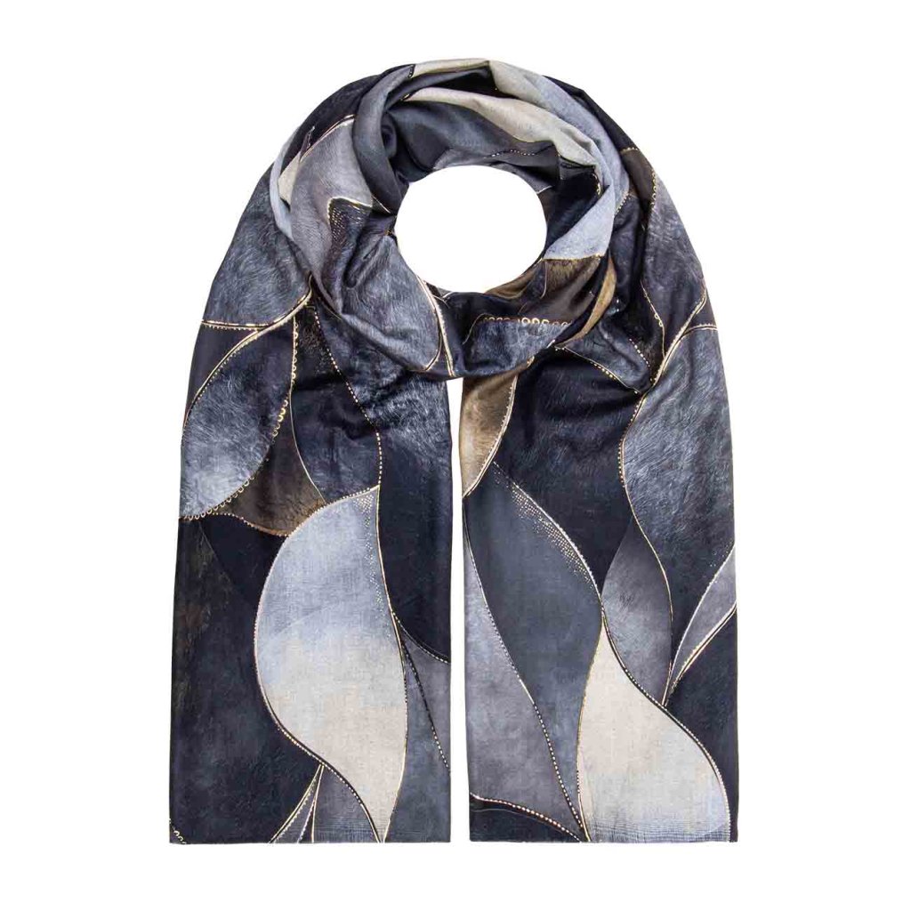 A modern, fekete, szürke és bézs színkombinációjú kendő univerzális kiegészítője minden napnak. Az arany nyomat finom fényt és luxusérzetet kölcsönöz neki.