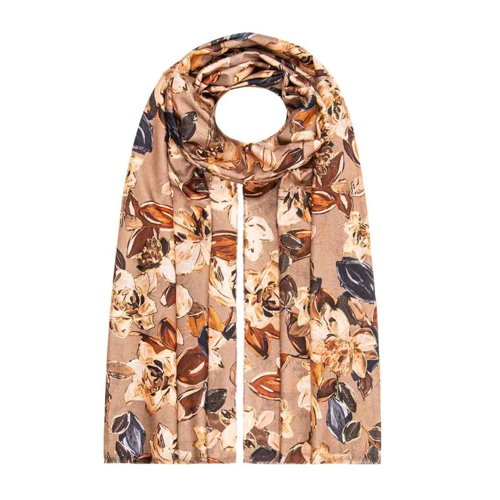 A meleg barna árnyalatok és a virágos dekoráció meghitt és elegáns kiegészítőt alkotnak. Tökéletes választás őszi és téli kombinációkhoz.