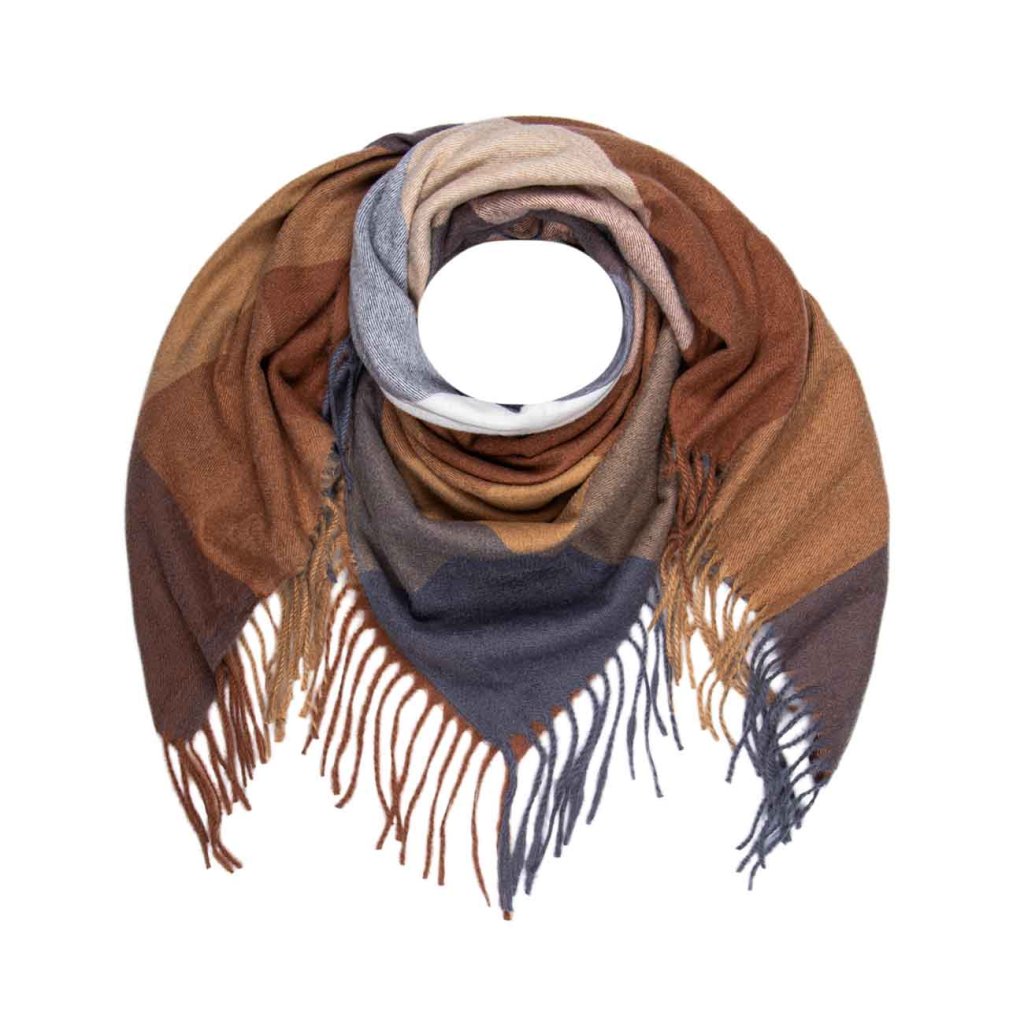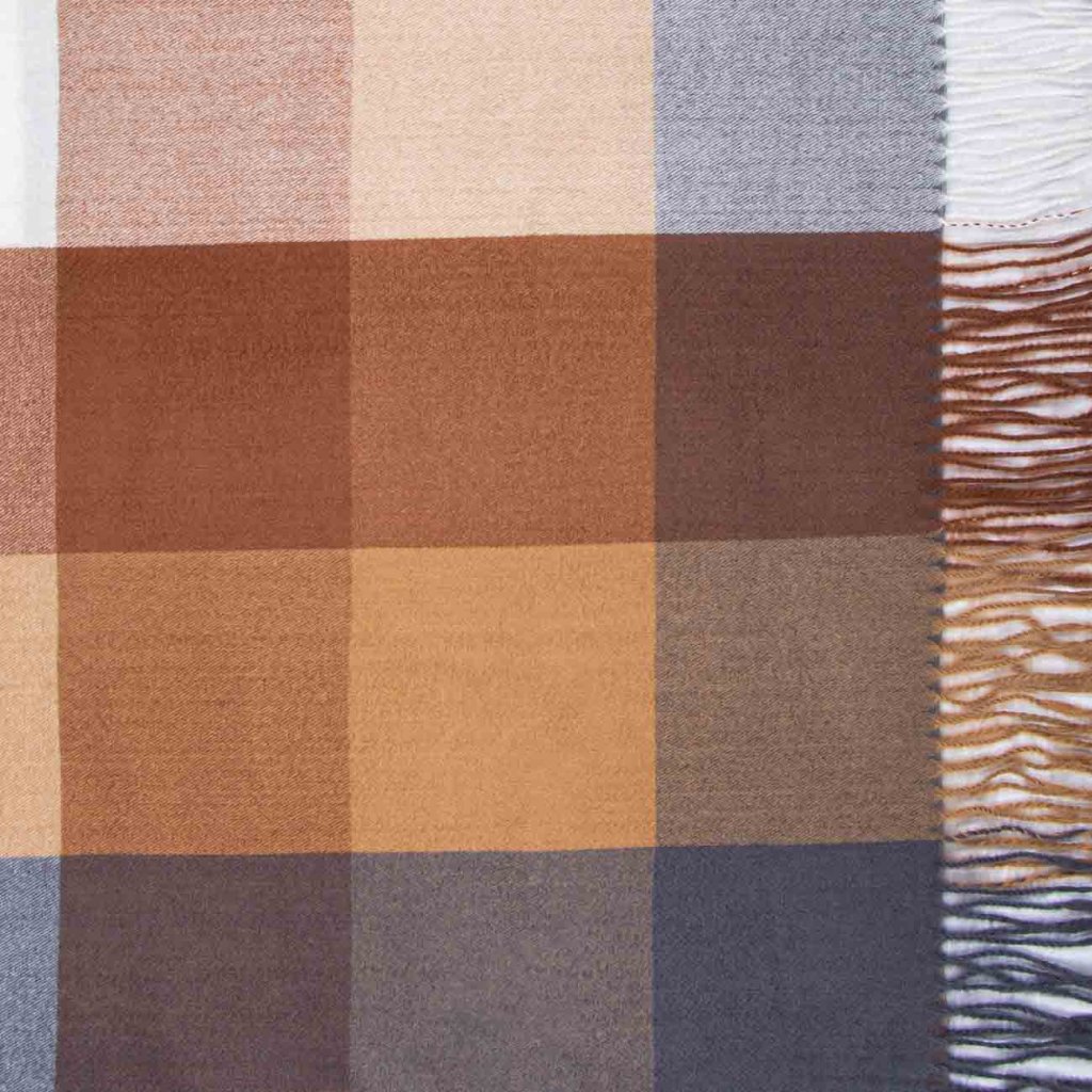 Elegáns női sál földszínekben, barna, bézs és szürke árnyalatokban. Az időtlen minta tökéletesen illik az őszi összeállításokhoz. A meleg anyag puha és nagyon kellemes tapintású.