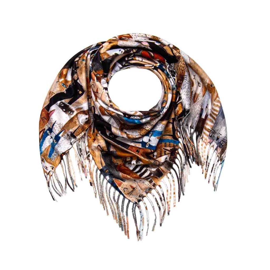 Ez a kendő remekül passzol a lezser és az elegáns összeállításokhoz is – örömet szerez minden macskarajongónak és az eredeti divatkiegészítők kedvelőinek.