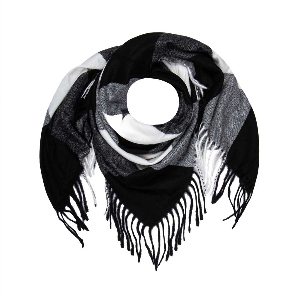 Klasszikus és időtlen női sál fekete-fehér színben. Az erős kontraszt csillogást és eleganciát kölcsönöz az öltözéknek. A meleg anyag finom szerkezettel kellemes viselet és tapintású.