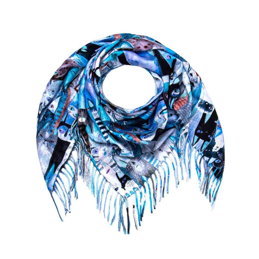 Az eredeti, négyzet alakú kendő játékos macskamintával, kék, türkiz, fehér, szürke és fekete árnyalatokban frissességet és játékos stílust kölcsönöz öltözékének. A kontrasztos színek és a kifejező design modern és merész hatást keltenek, így a kendő egy feltűnő kiegészítővé válik. A viszkóz és kasmír keveréke puhává, melegévé és könnyűvé teszi a kendőt, így egész évben kellemes viseletet biztosít. A szegélyen lévő díszítő rojtok egyedi bájt kölcsönöznek a kendőnek, kiemelve annak egyedi karakterét.