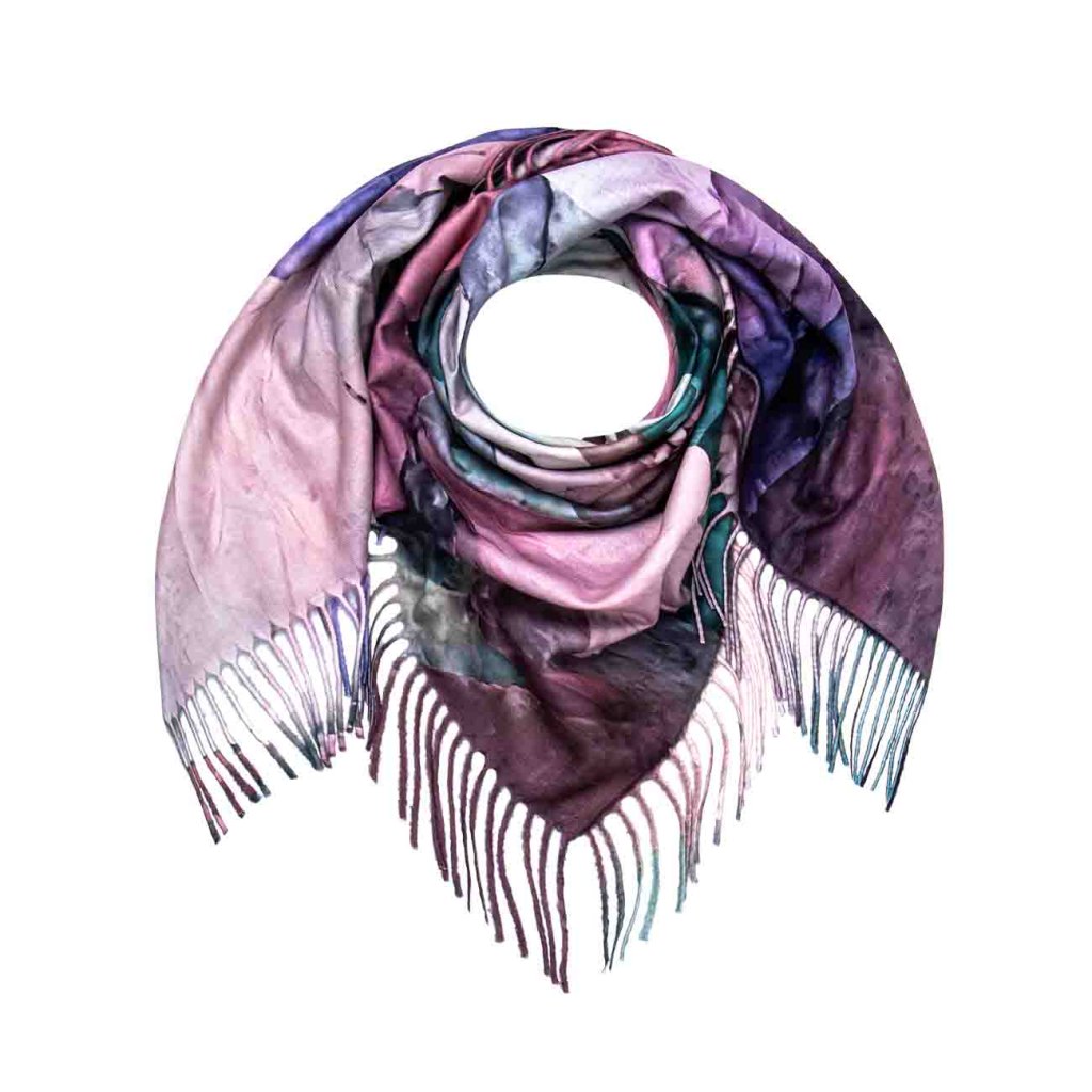 Elegáns, négyzet alakú kendő, amely első pillantásra megragadja a figyelmet finom, rózsaszín, lila és fehér árnyalatú virágmintájával, amelyet kontrasztos, sötétebb háttér egészít ki. A finom, kasmír keverékű anyag puha tapintású és meleg, így ideális kiegészítő a hűvösebb napokra. A gazdag rojtoknak köszönhetően légies hatást kelt, és luxusérzetet kölcsönöz a megjelenésnek. Sokféleképpen viselhető – a nyak köré, a vállakon átvetve vagy plédként megkötve.