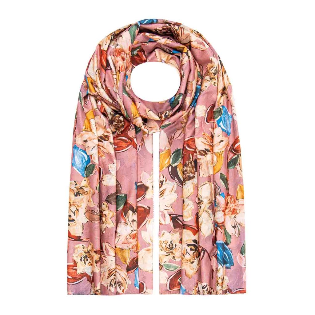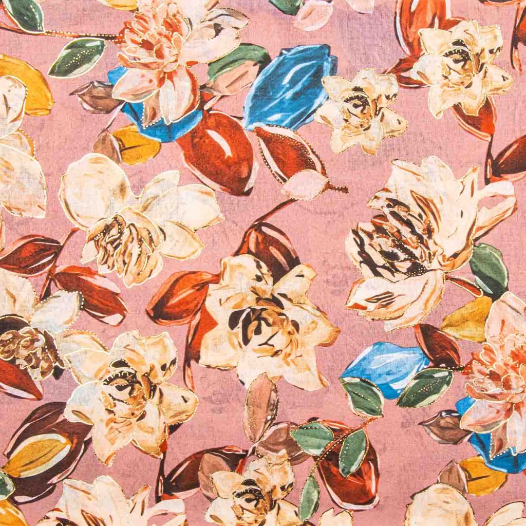 A romantikus, rózsaszín tónusú sál színes virágokkal és finom aranynyomattal finomságot és eleganciát kölcsönöz a megjelenésednek. Ideális egyszínű kabátok vagy pulóverek feldobására.
