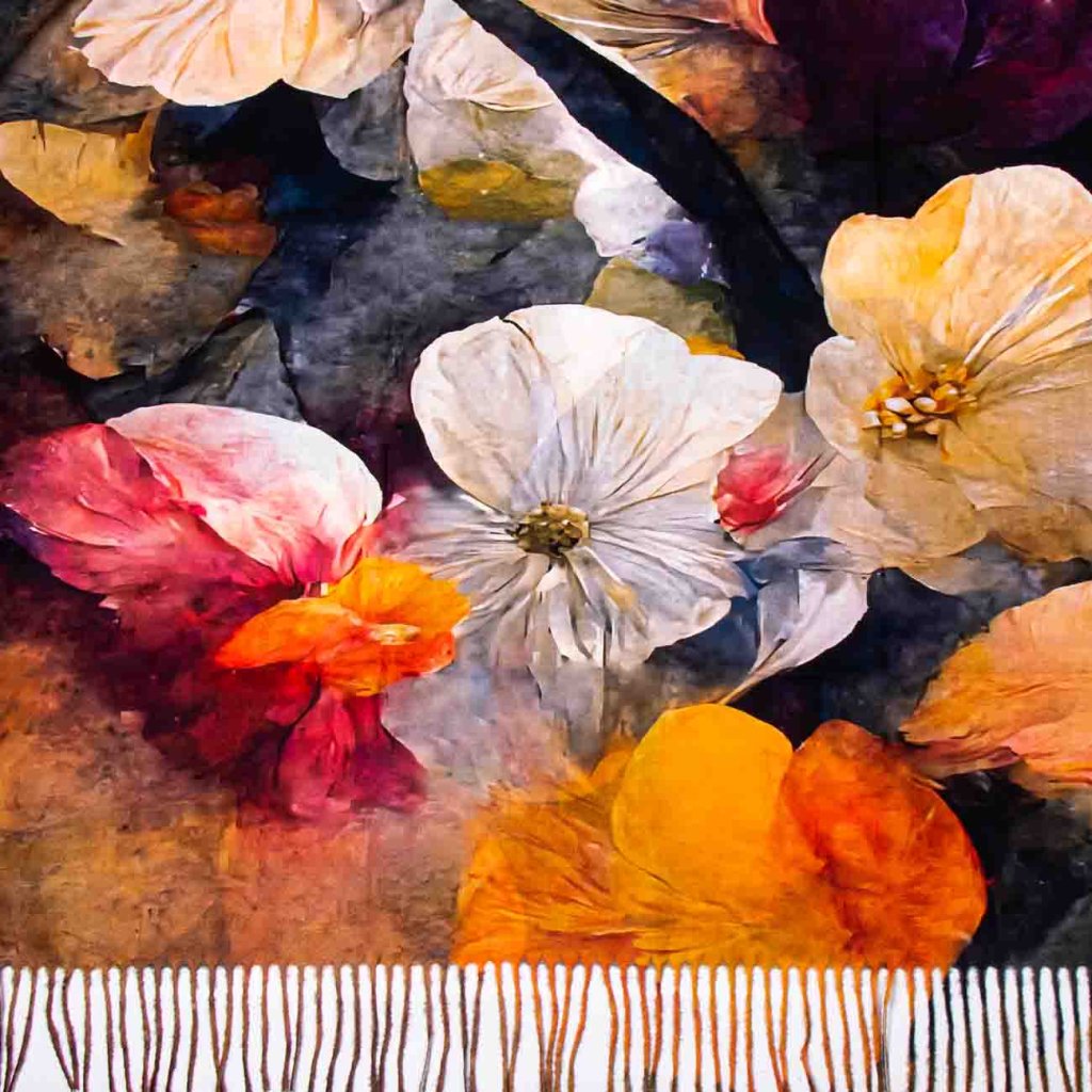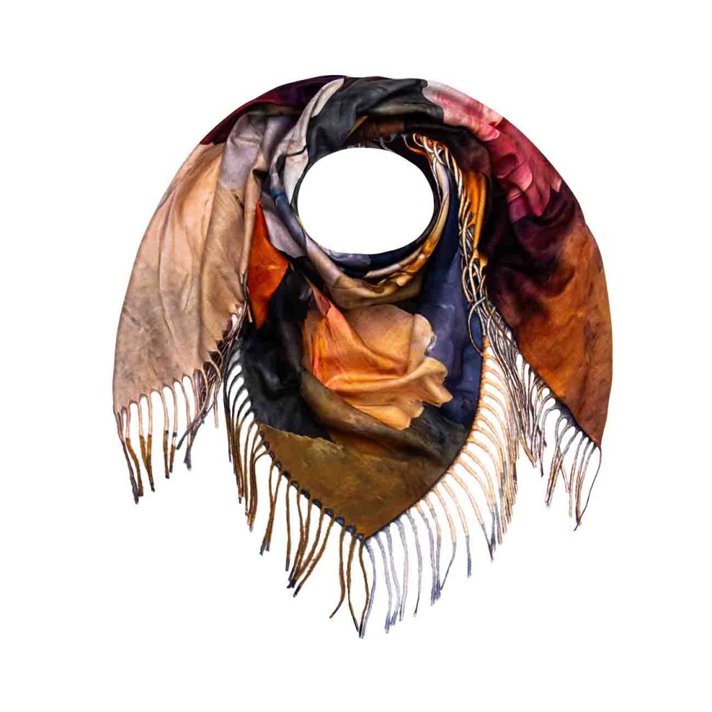 A luxus négyzet alakú sál finom virágmintával, arany, narancs, fehér és barna árnyalatokban meleg és elegáns megjelenést kölcsönöz öltözékének. A telített színek és a kidolgozott virágminta kifinomult és időtálló hatást keltenek. A viszkóz és a kasmír kombinációjának köszönhetően a sál puha tapintású, könnyű és meleg, így ideális egész éves viseletre. A szegélyt díszes rojtok zárják, amelyek fokozzák a sármját.
