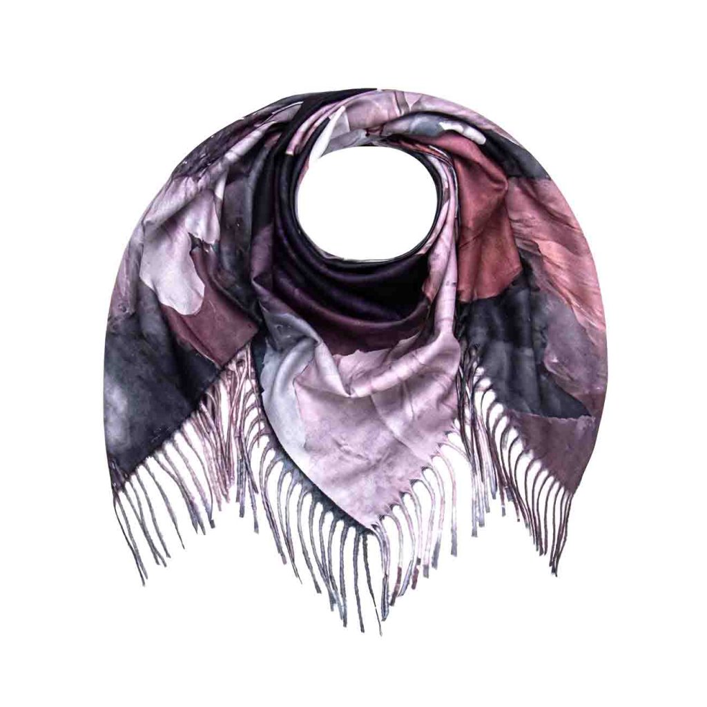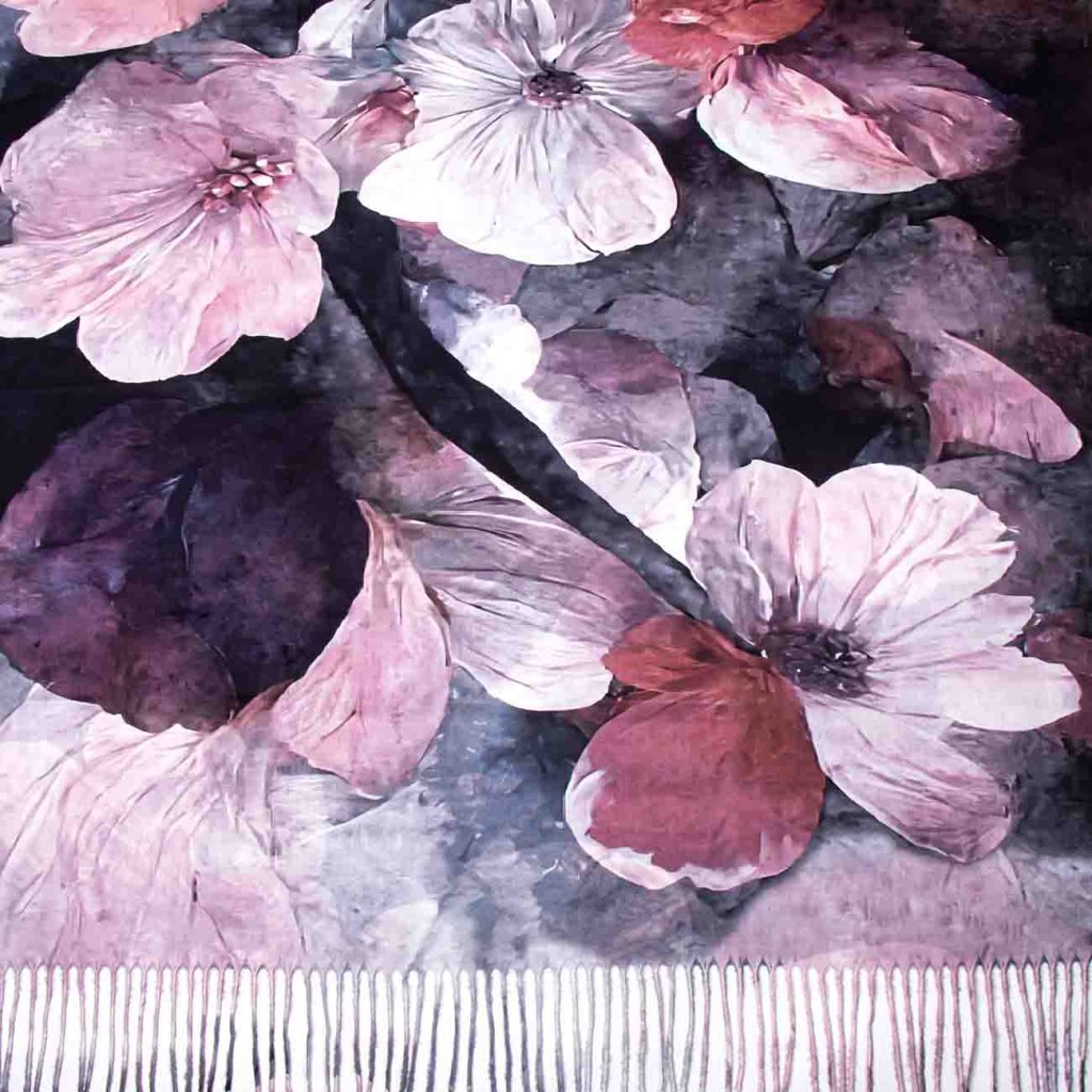 Elegáns, négyzet alakú kendő finom virágmintával, amely eredetiségével és időtlen stílusával tűnik ki. A rózsaszín, bordó és lila árnyalatok finom kombinációja sötét alapon lenyűgöző dizájnt hoz létre, amely minden öltözéket feldob. A puha, magas kasmír tartalmú anyag melegséget és könnyedséget biztosít, így ideális egész éves viseletre. A kerületén lévő rojtok játékos és nőies jelleget kölcsönöznek a kendőnek.