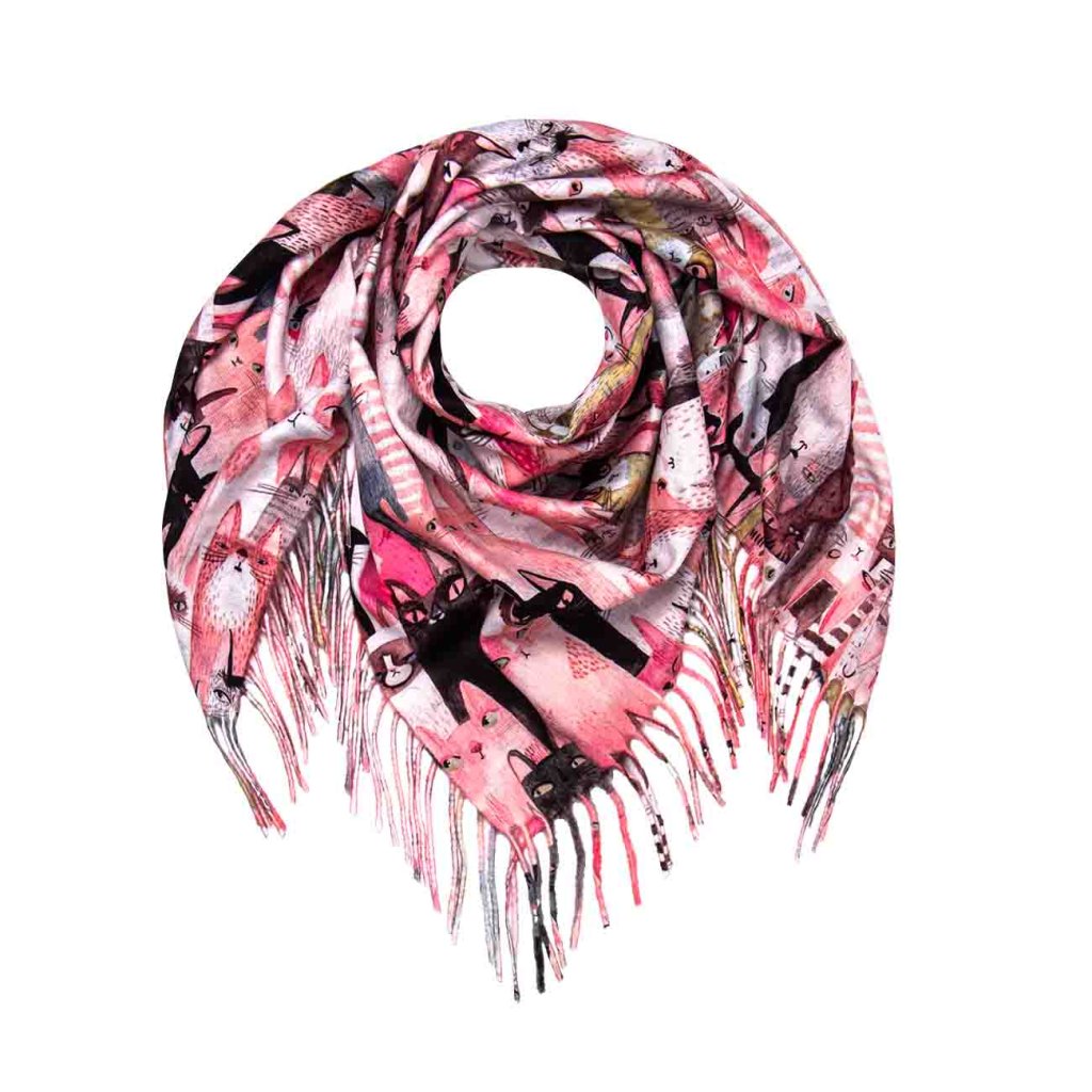 Az eredeti, négyszögletes, játékos macskamintás kendő rózsaszín, fekete, fehér és szürke árnyalatokban egy csipetnyi játékosságot és egyedi stílust kölcsönöz öltözékének. A kifejező macskaminta vidám, ugyanakkor elegáns hatást kelt. A viszkóz és a kasmír kombinációjának köszönhetően a kendő puha, kellemes tapintású és meleg, így alkalmas mindennapi viseletre és különleges alkalmakra is. A díszes rojtok modern stílust kölcsönöznek a sálnak.