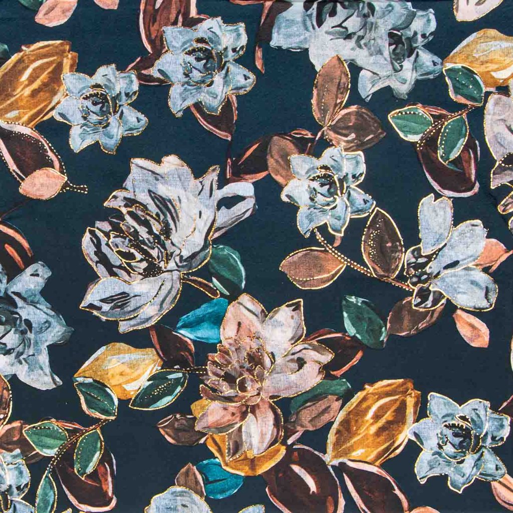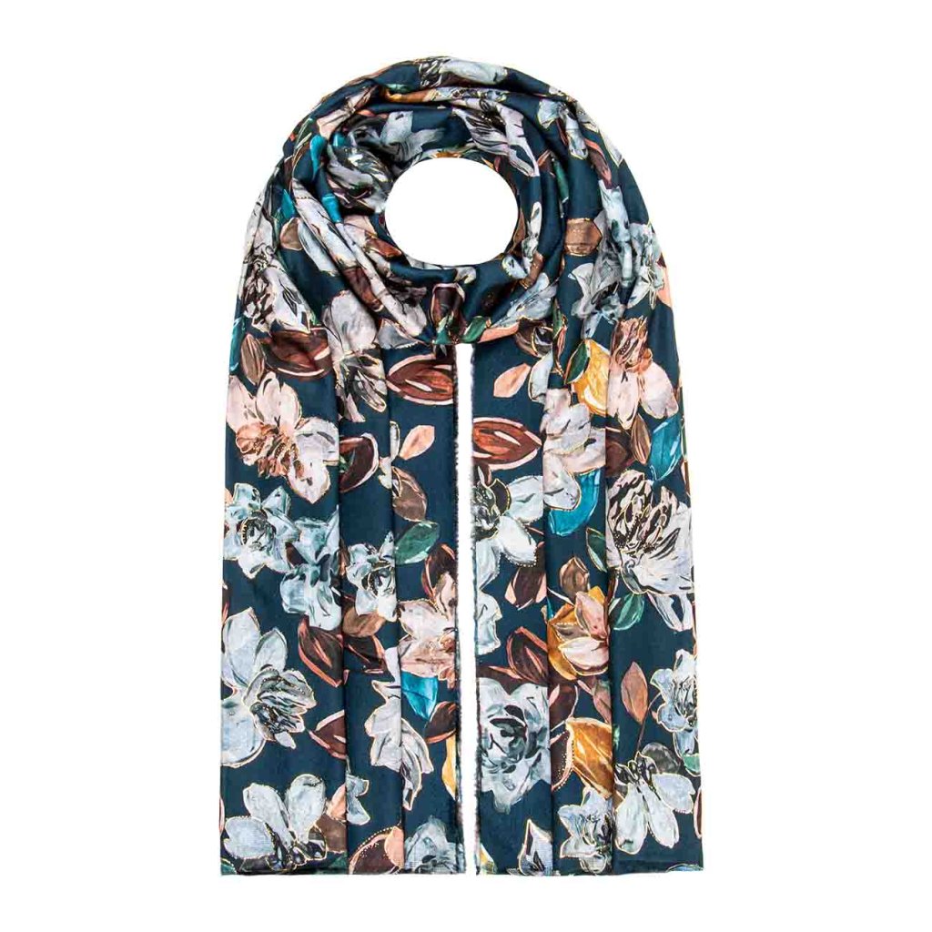 A smaragdzöld alapon színes virágokkal díszített, feltűnő sál ideális azok számára, akik egyediséget és frissességet szeretnének kölcsönözni öltözéküknek.