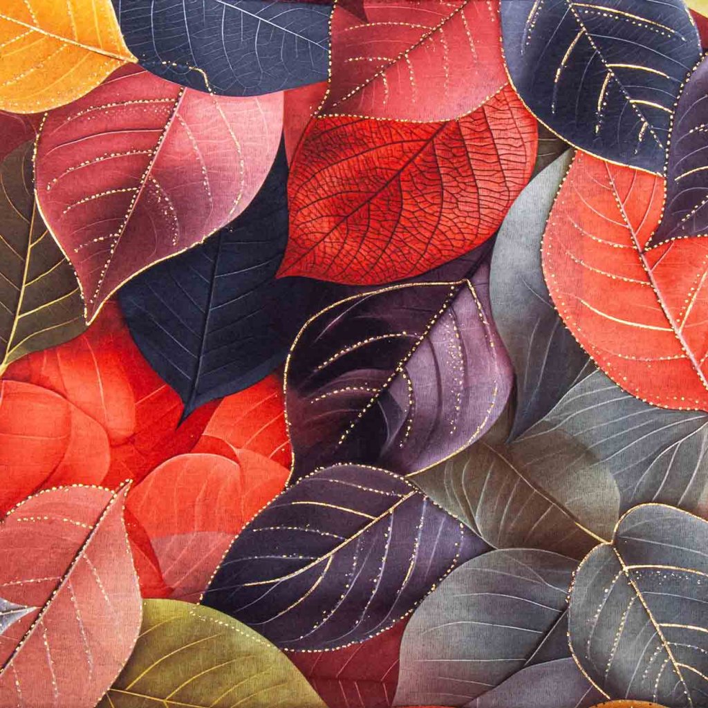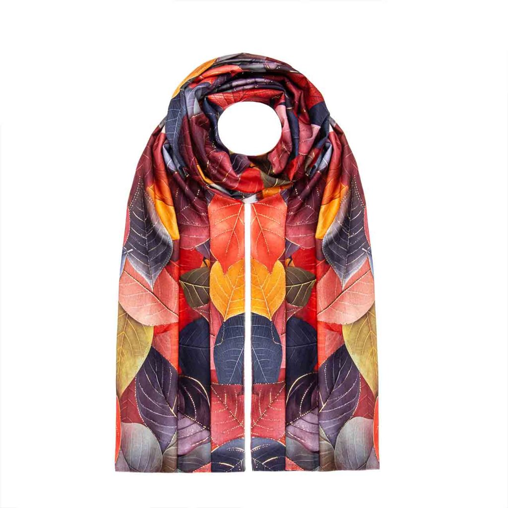 A piros, narancssárga és arany árnyalatú, levélmintás, feltűnő sál játékos és energikus hatást kelt. Az egyik oldala aranynyomással díszített, ami elegáns csillogást kölcsönöz a sálnak. Remek kiegészítő a téli ruhatárhoz.