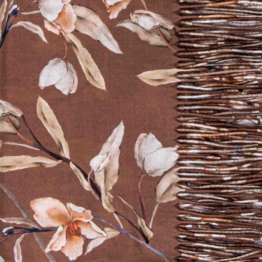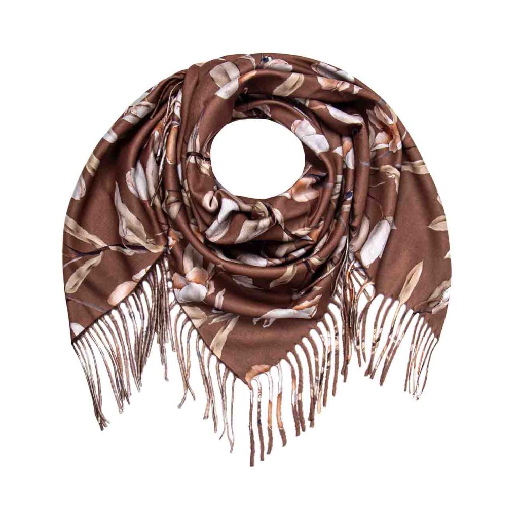 A luxus, négyzet alakú kendő finom virágmintával, barna, bézs, fehér és enyhén narancssárga tónusokban eleganciát és bájt kölcsönöz öltözékének. A visszafogott, természetes motívum romantikus és időtlen hatást kelt, míg a mélybarna szín gyönyörűen kiemeli stílusát. A viszkóz és a kasmír kombinációja biztosítja a finom tapintást, a melegséget és a könnyedséget, így ideális mindennapi viseletre és különleges alkalmakra egyaránt. A széleket szegélyező díszes rojtok játékos részletet adnak a kendőnek.