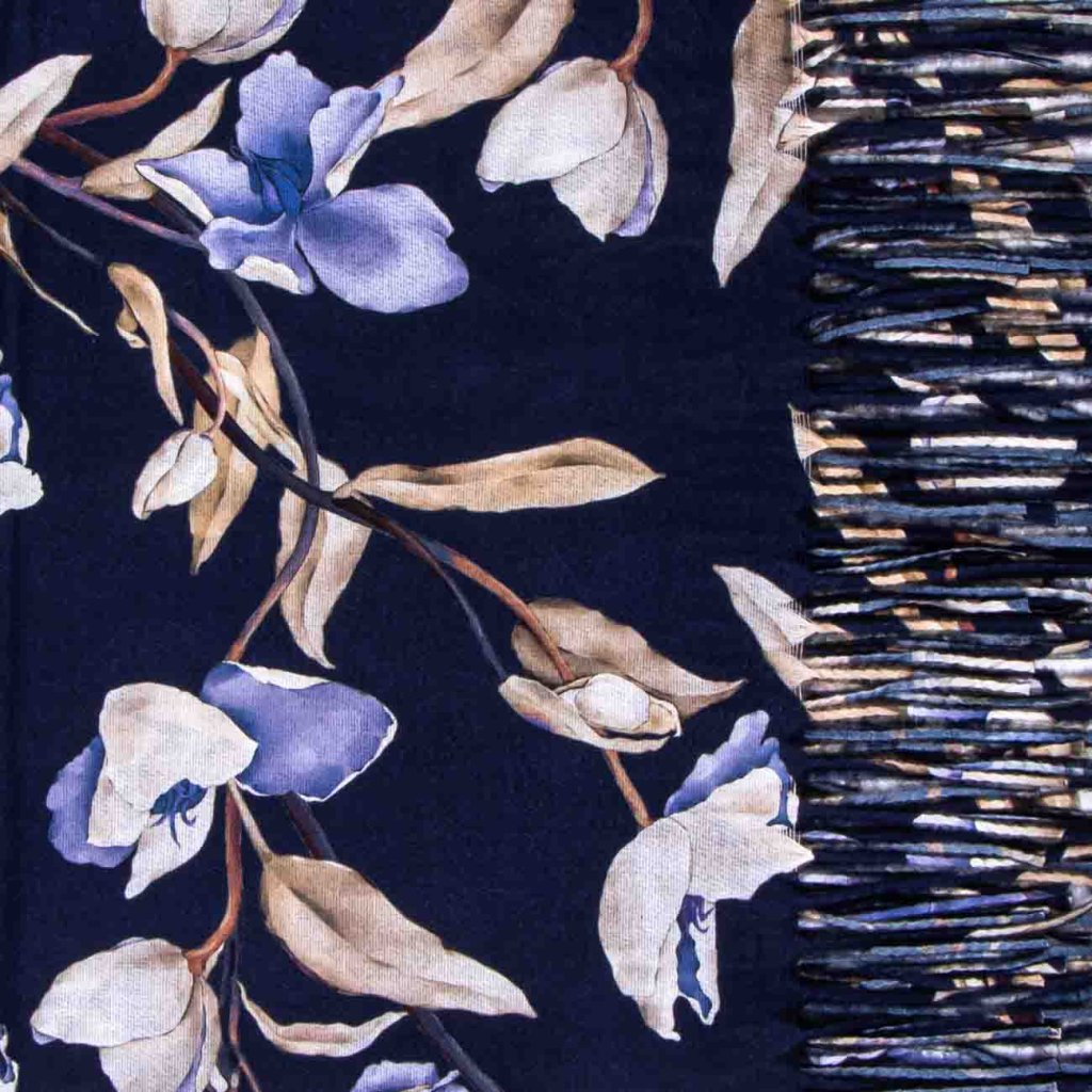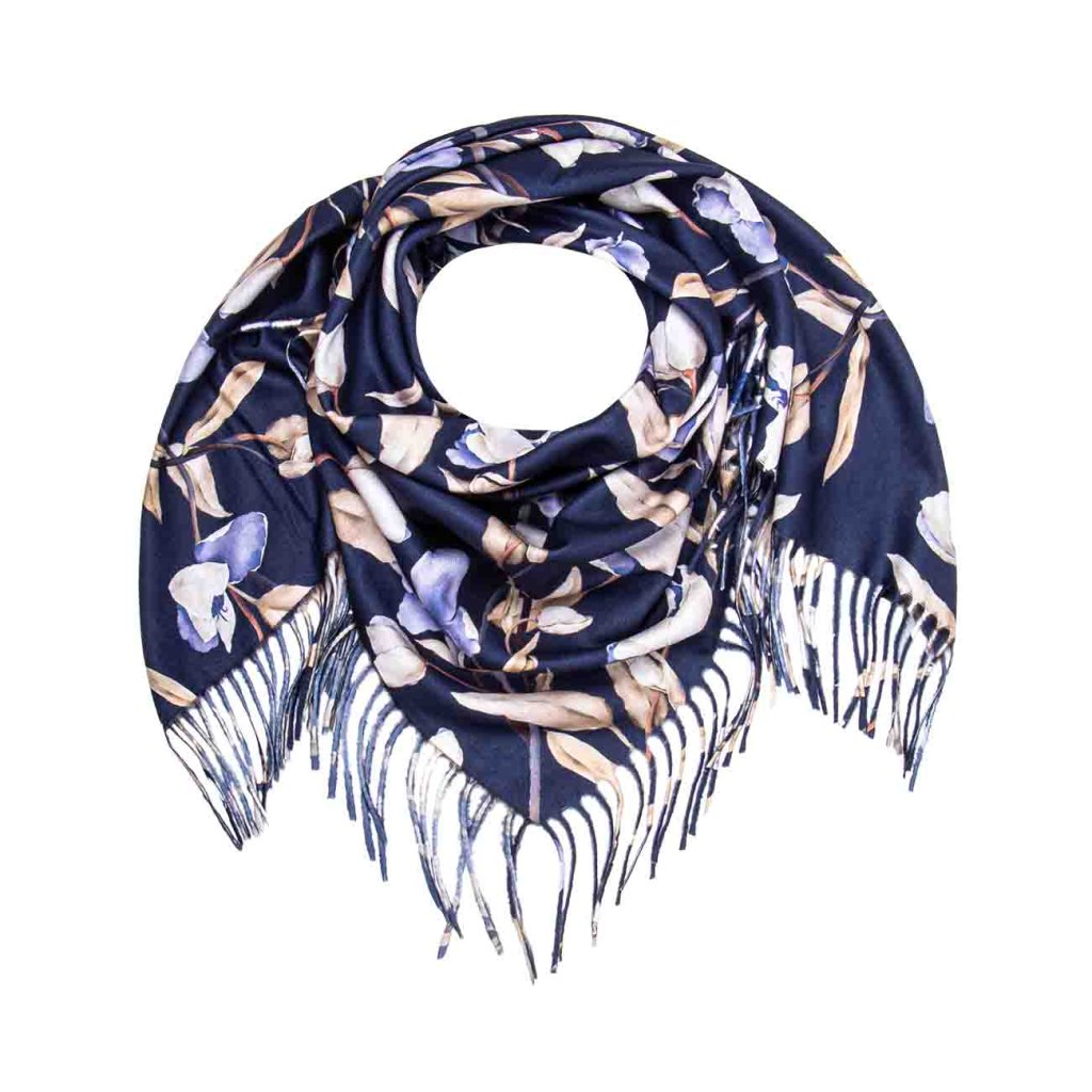 Stílusos, sötétkék virágmintás kendő fehér-lila árnyalatokban. Kiváló választás azoknak a nőknek, akik elegánsan szeretnének megjelenni, és egyben színekkel feldobni a megjelenésüket.
