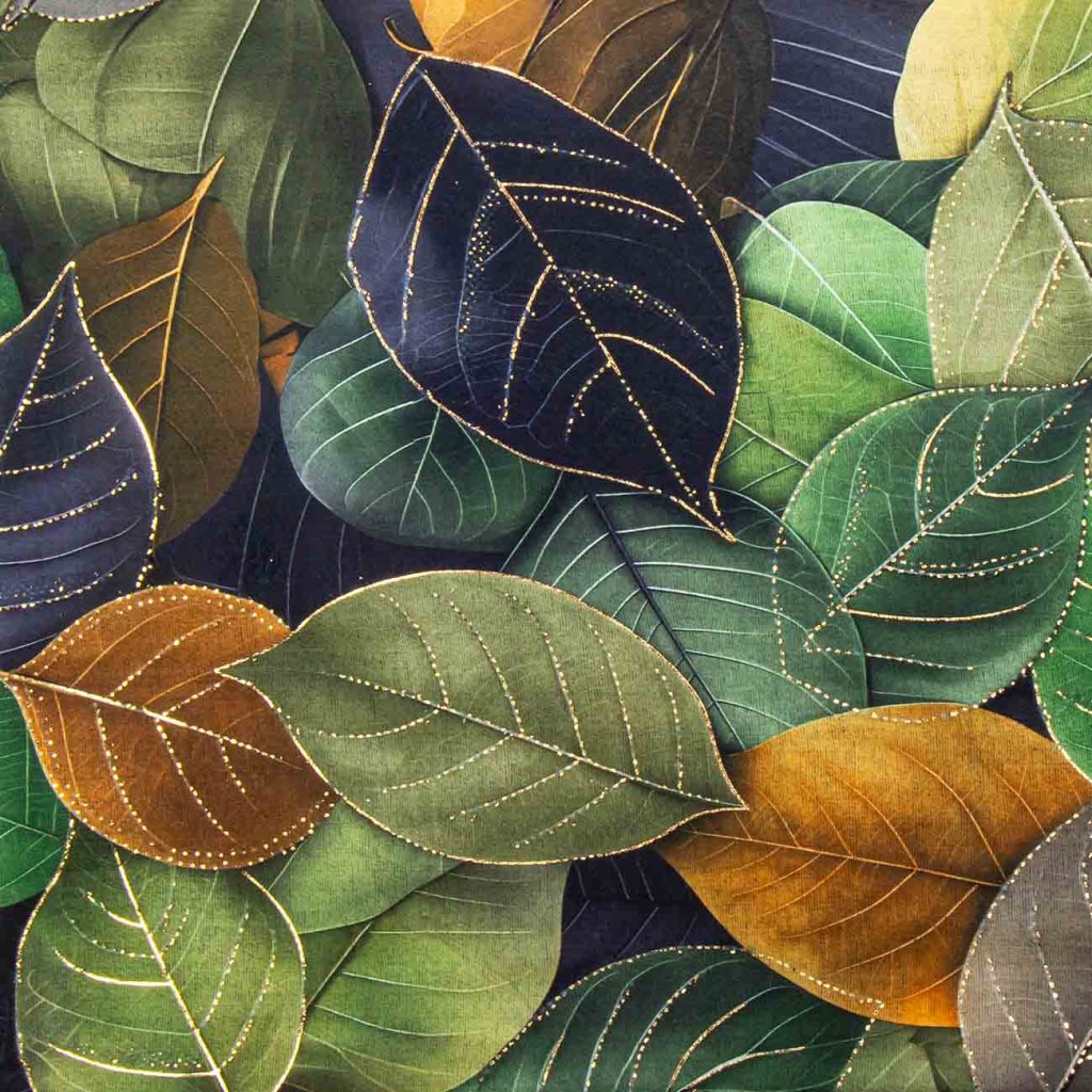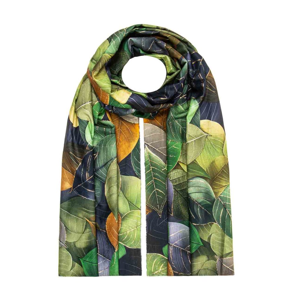 A zöld levelek motívumával ellátott, élénk tónusú sál a természet színeire emlékeztet. Az egyik oldalán található aranynyomatnak köszönhetően friss és elegáns hatást kelt. Tökéletes kiegészítő, amely feldobja az egyszerű öltözéket.
