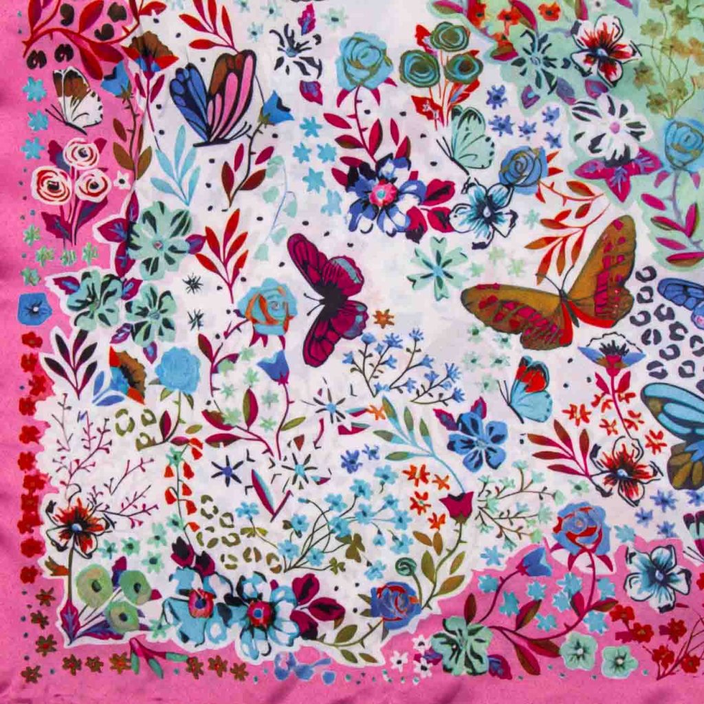 Finom, nőies, modern sál virágmintával és pillangókkal.