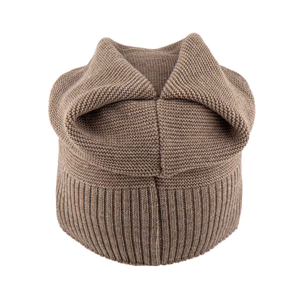 Finom bézs sapka puha kötött anyagból, amely könnyedséget és elegáns természetességet kölcsönöz a téli szettnek.