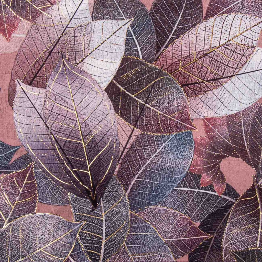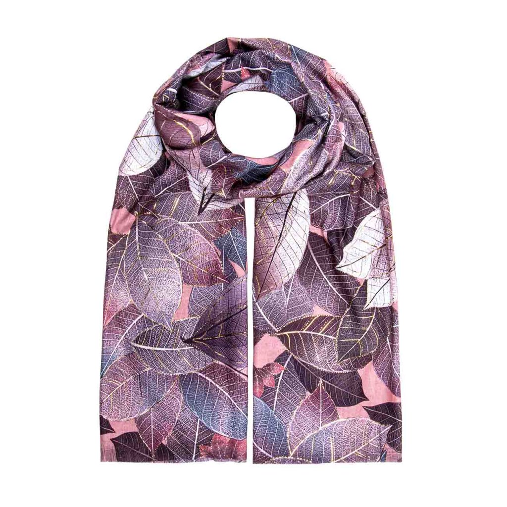 A rózsaszín és lila árnyalatú, finom levélmintás sál romantikus és elegáns hatást kelt. A fényes, arany nyomat luxus hangsúlyt kölcsönöz a teljes mintának, és kiemeli a levelek részleteit. Gyönyörű kiegészítő, amely feldobja bármelyik öltözéket.