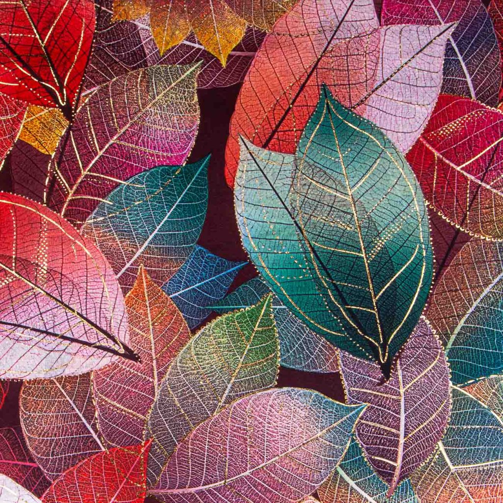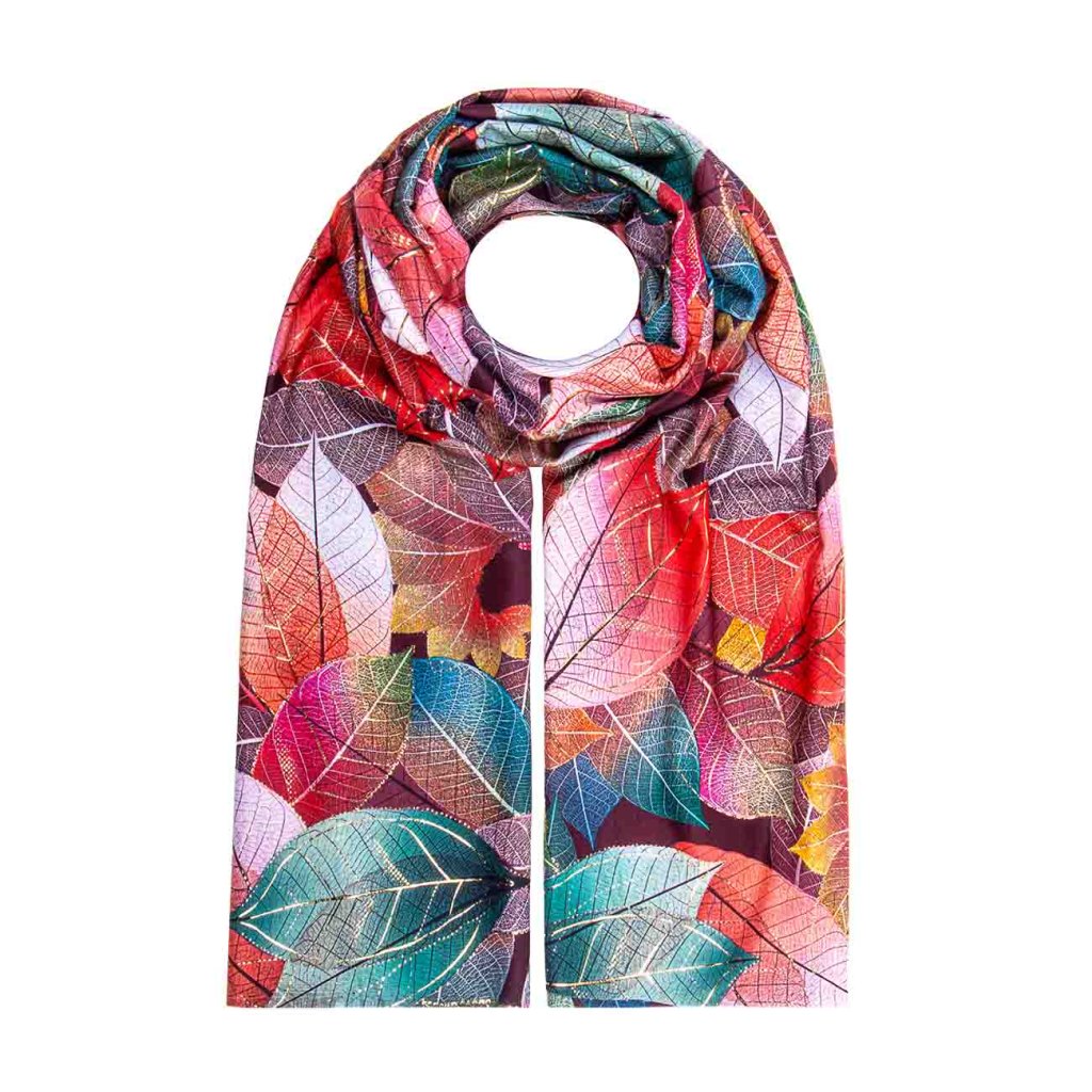 Élénk, levélmintás kendő a piros, narancssárga, rózsaszín és zöld telített árnyalataiban. Az arany nyomat kiemeli a színek játékosságát, és ünnepi hangulatot kölcsönöz a kendőnek. Tökéletes kiegészítő a merész kombinációkhoz.