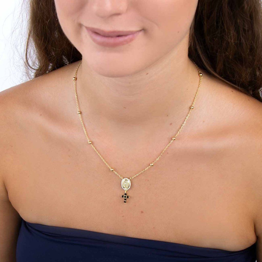 Elegáns nyaklánc, amely ötvözi a spirituális szimbolikát és a modern ékszerkészítést. A domináns elem egy ovális medál Szűz Mária ábrázolásával, finom, tiszta kövekkel szegélyezve. Erről szabadon lóg egy apró fekete gyöngyökből álló kereszt, amely kontrasztot és mélységet kölcsönöz az ékszernek. A láncot fényes golyók díszítik, és az egész ékszer valódi 14 karátos arannyal van bevonva.