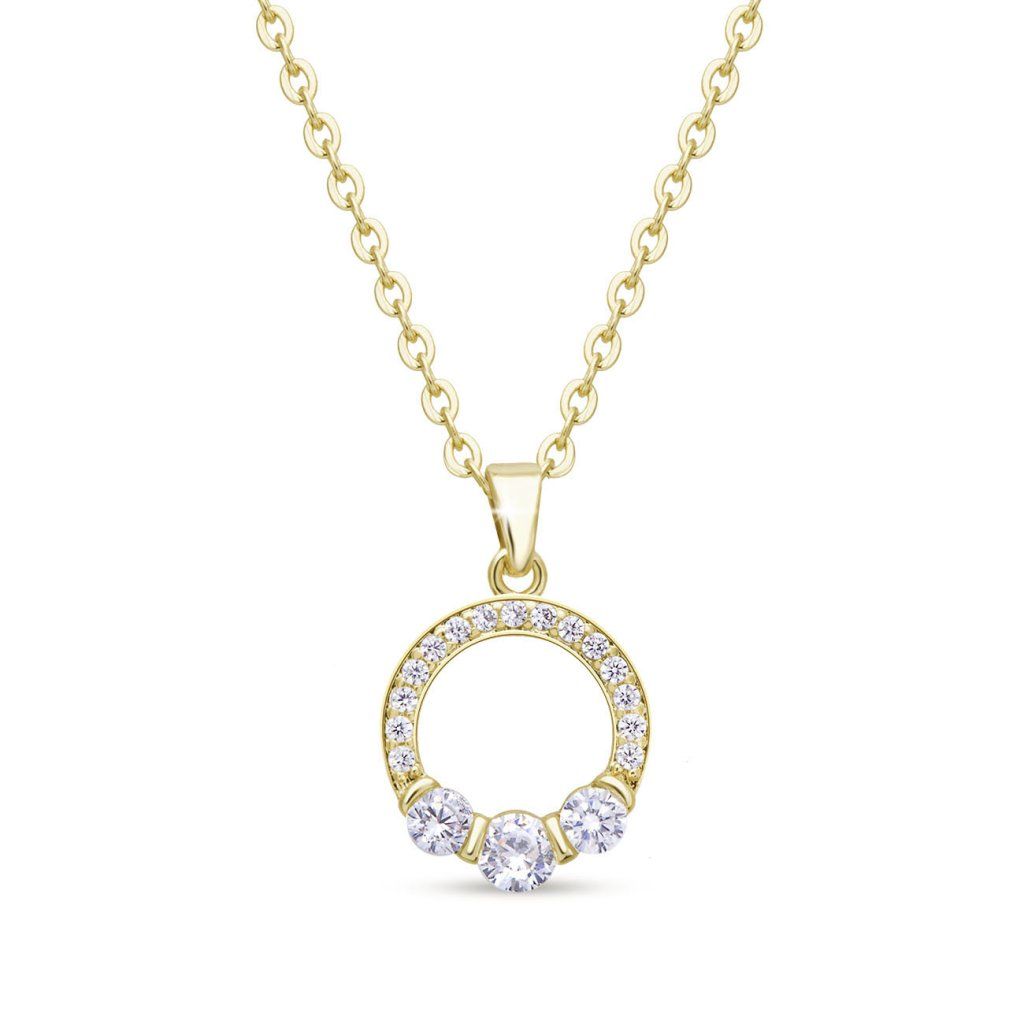 Szett aranyozott 14k -nyaklánc medállal és fülbevaló kör alakú dizájnban, a teljes kerületén cirkónia kövekkel.