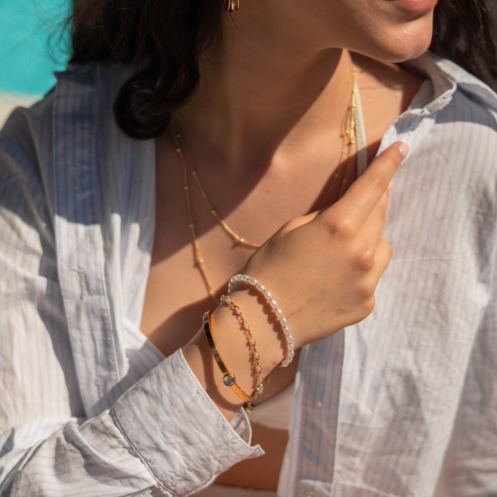 Aranyozott 14k arannyal bevont sebészeti acél karkötő ovális gyöngyökkel, melyek arany színű gyöngyökkel váltakoznak.