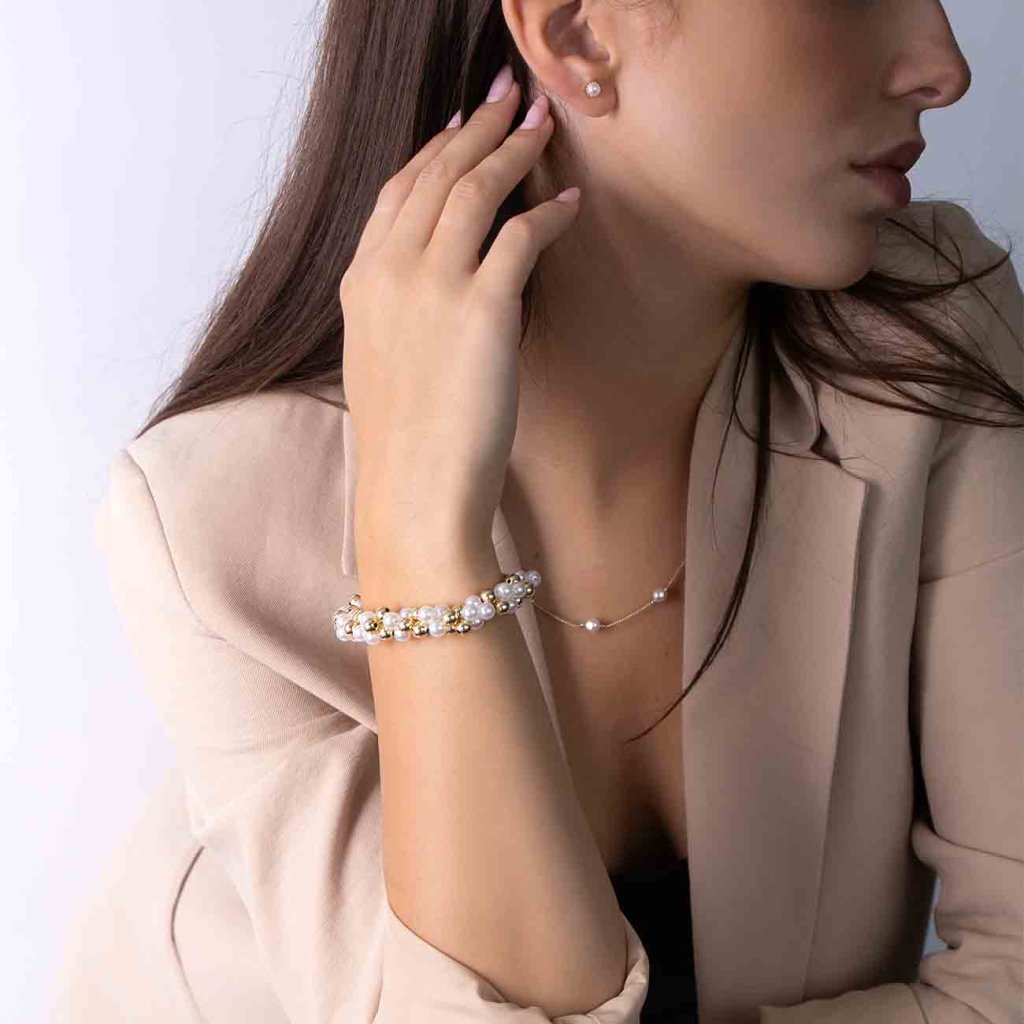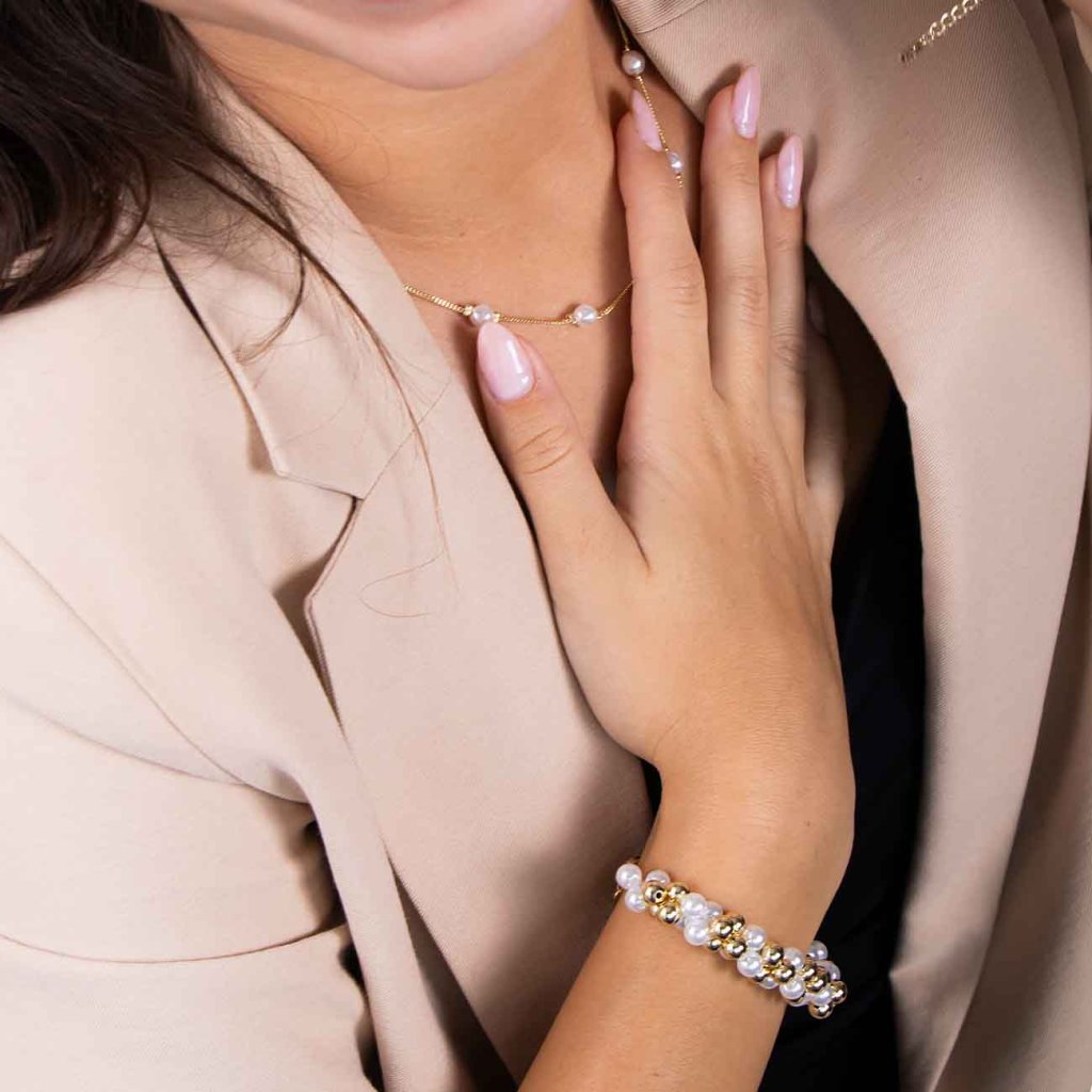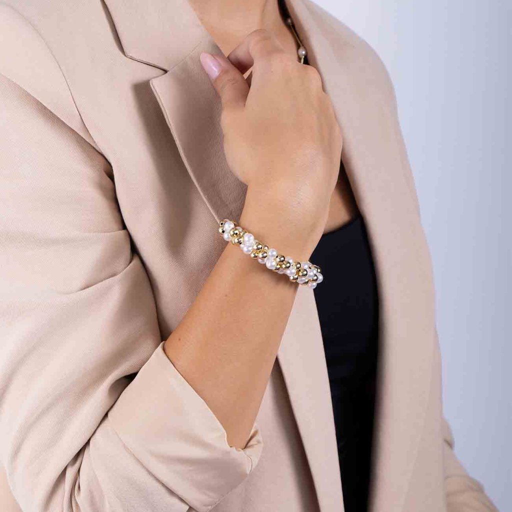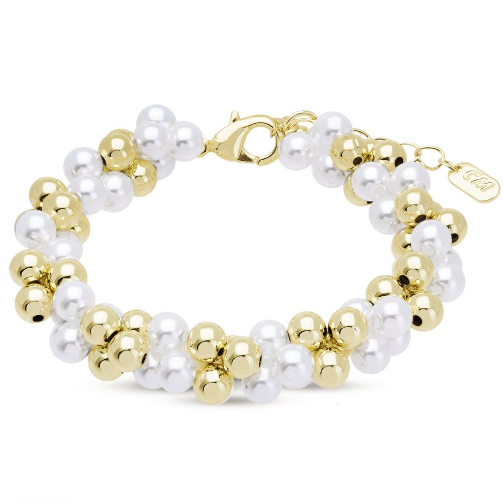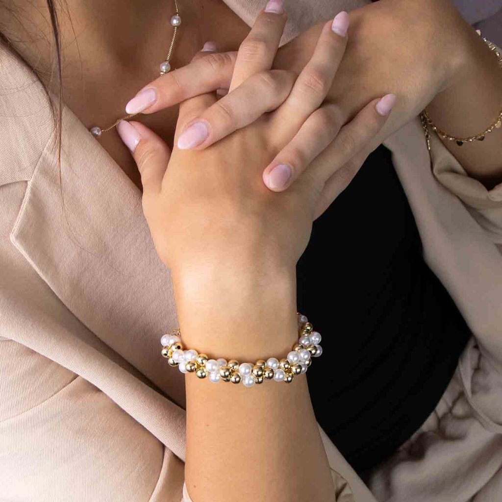 A stílusos, fehér és arany gyöngyökkel váltakozó karkötő játékos, mégis elegáns hangsúlyt kölcsönöz öltözékének. A gyöngyök és a fémgolyók fényes felülete kiemeli a nőiességet és a könnyedséget, míg a masszív karabineres záródás kényelmes és biztonságos viseletet biztosít. Tökéletes választás mindennapi és ünnepi alkalmakra egyaránt.