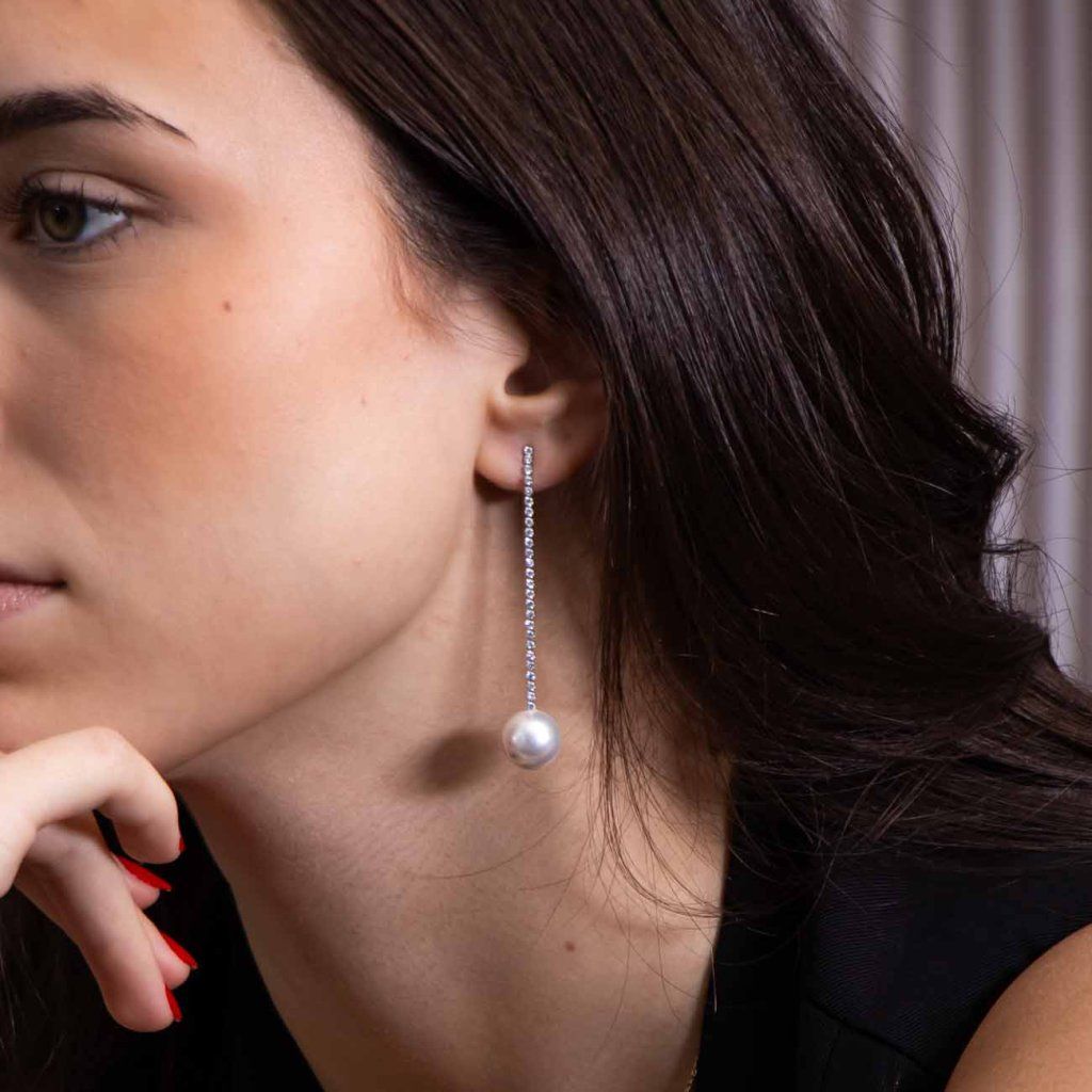 Elegáns, finom cirkónium vonallal és markáns, sebészeti acél gyönggyel díszített, függő fülbevaló.