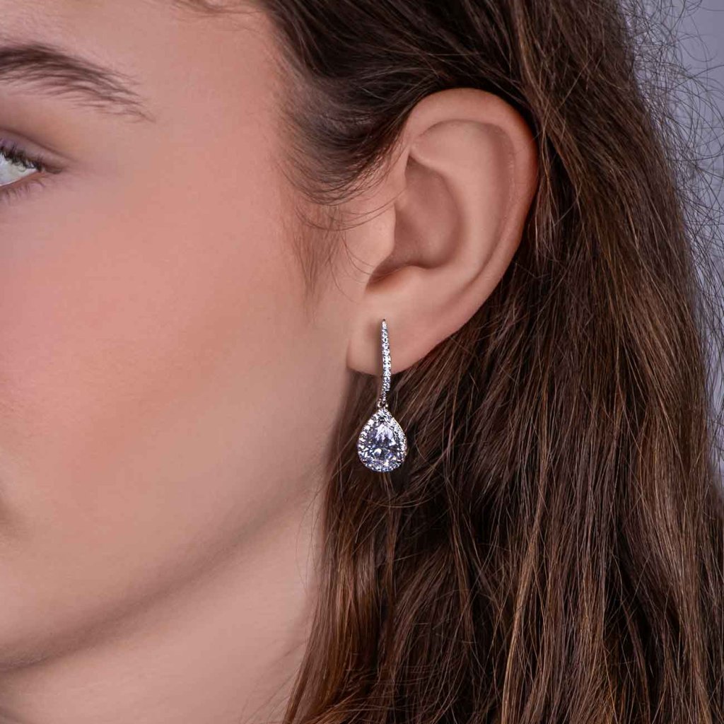 Ródiummal bevont fülbevaló nagy csepp alakú cirkóniával, kerületükön kis cirkóniákkal bélelve. A zárrész is nagyon látványos - ez is apró cirkonokkal van kirakva.