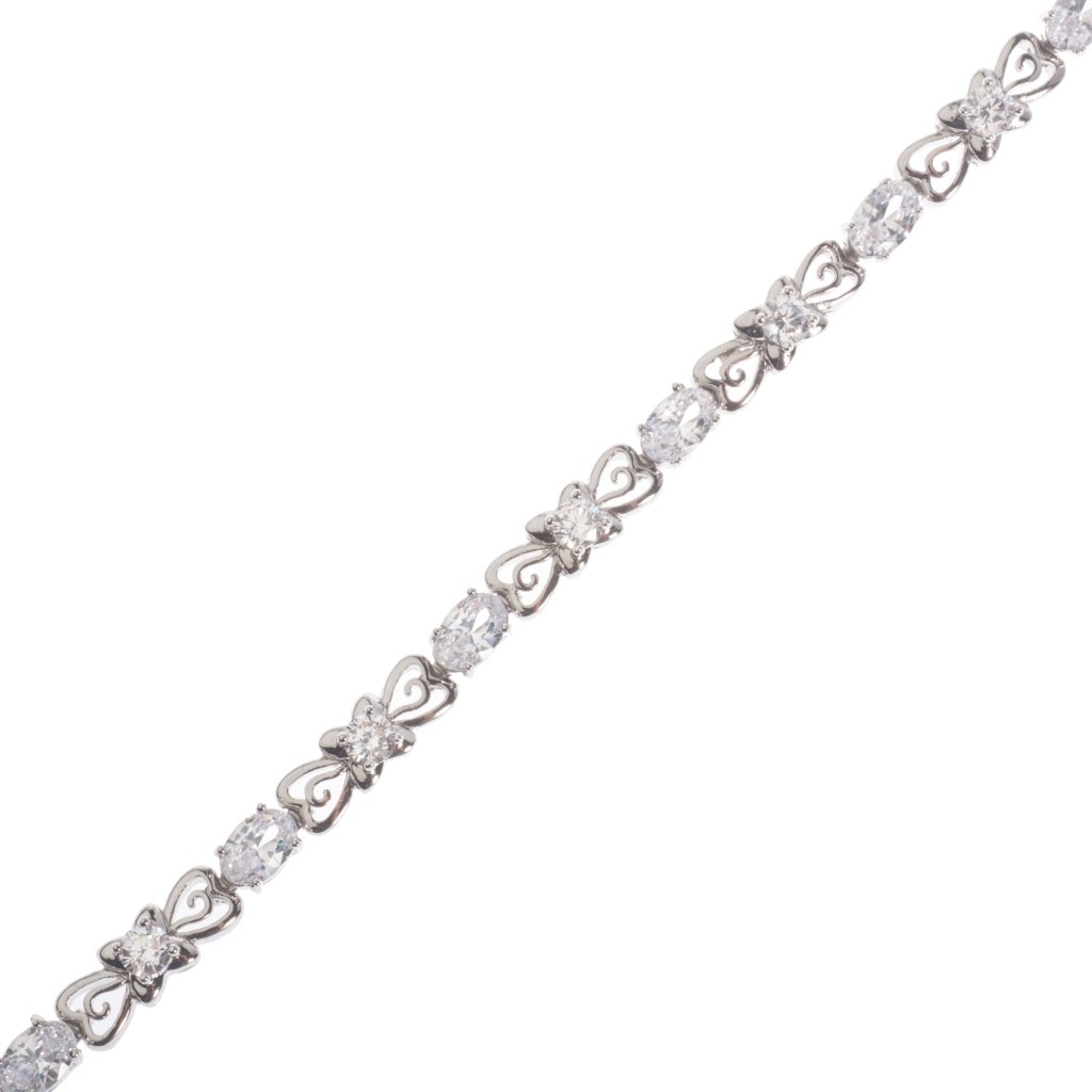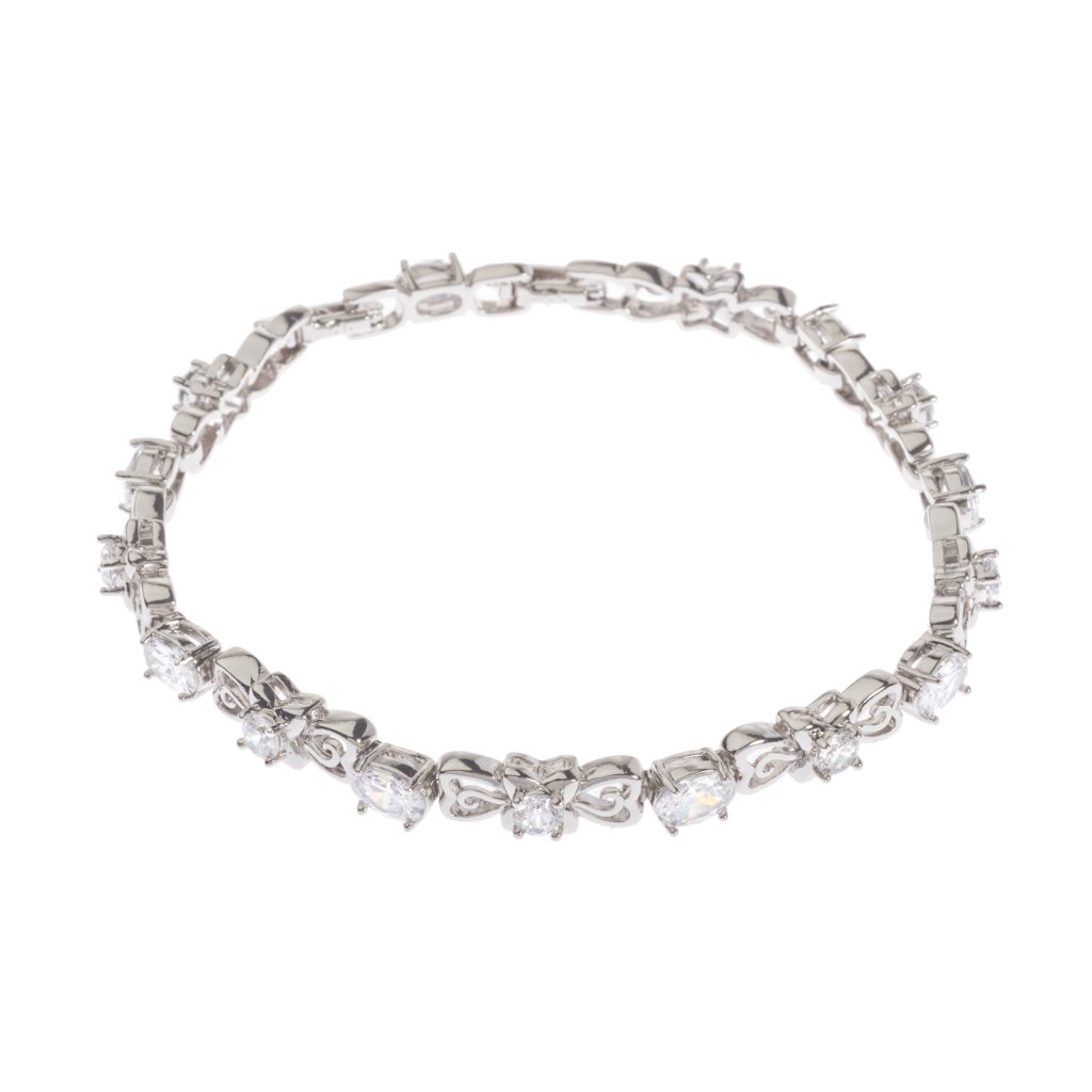 Karkötő ródiumozott virágokkal és cirkonokkal. Finom megjelenésű és gyönyörűen csillogó karkötő.