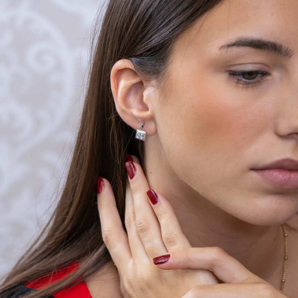 Kifejező fülbevaló, központi, tiszta, négyzet alakú csiszolású cirkóniummal, finom kövekkel kiegészítve az oldalán, eleganciát és ragyogást kölcsönöz minden mozdulatnak. A masszív design a fényes, ródiumozott fémmel kombinálva olyan ékszert alkot, amely nem marad észrevétlen.