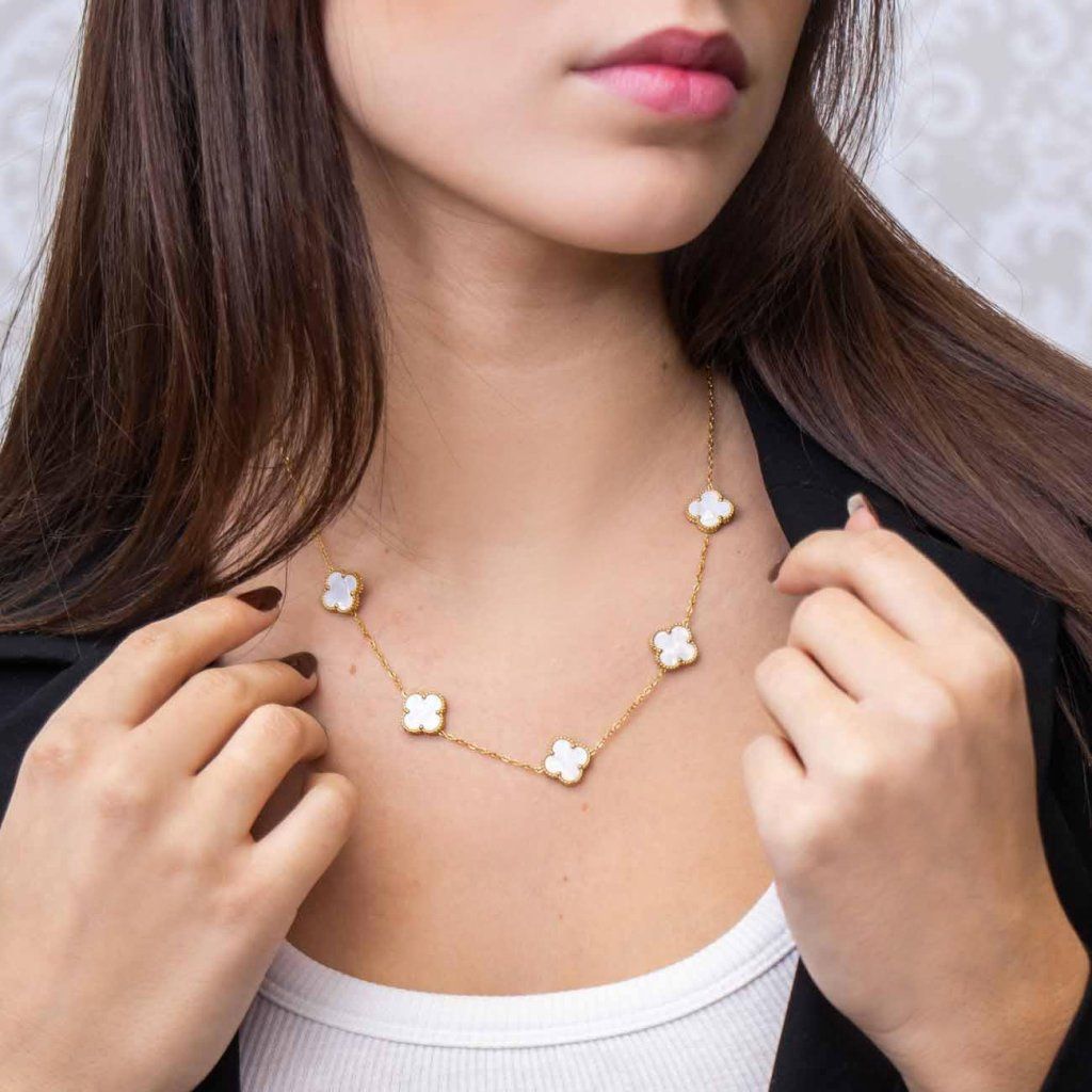 Finom aranyozott 14k lánc sebészeti acélból. Fix kétoldalas medál virág alakban, fehér gyöngyházfénnyel.