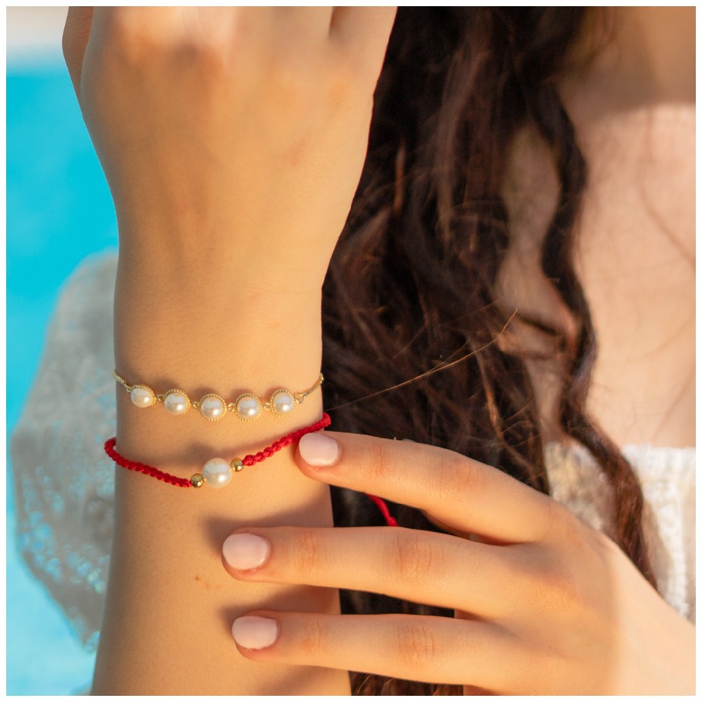 - Sebészeti acélból készült zsinórkarkötő, fehér gyöngy, piros zsinórral.