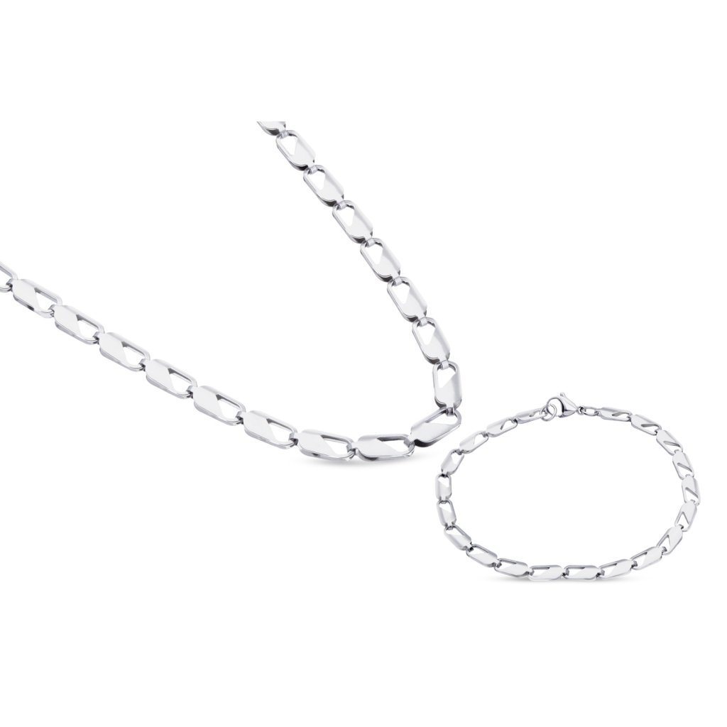 Elegáns, sebészeti acélból készült nyaklánc- és karkötőkészlet modern dizájnnal, precízen csiszolt négyszögletes szemekkel. A minimalista, fényes kivitel időtlen stílust hangsúlyoz, és könnyen kombinálható más kiegészítőkkel. A masszív anyag és a precíz kidolgozás ideálissá teszi mindennapi viseletre, mind különleges alkalmakra.