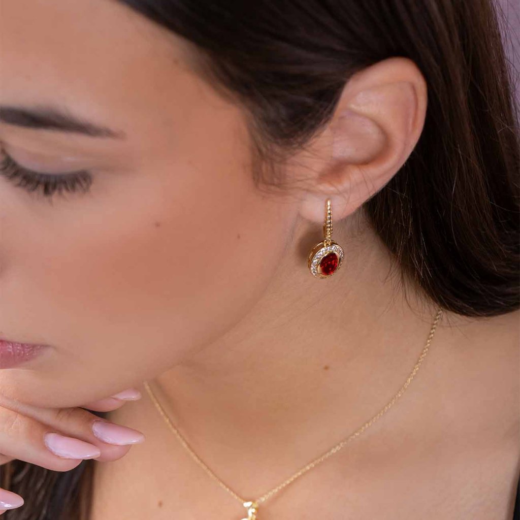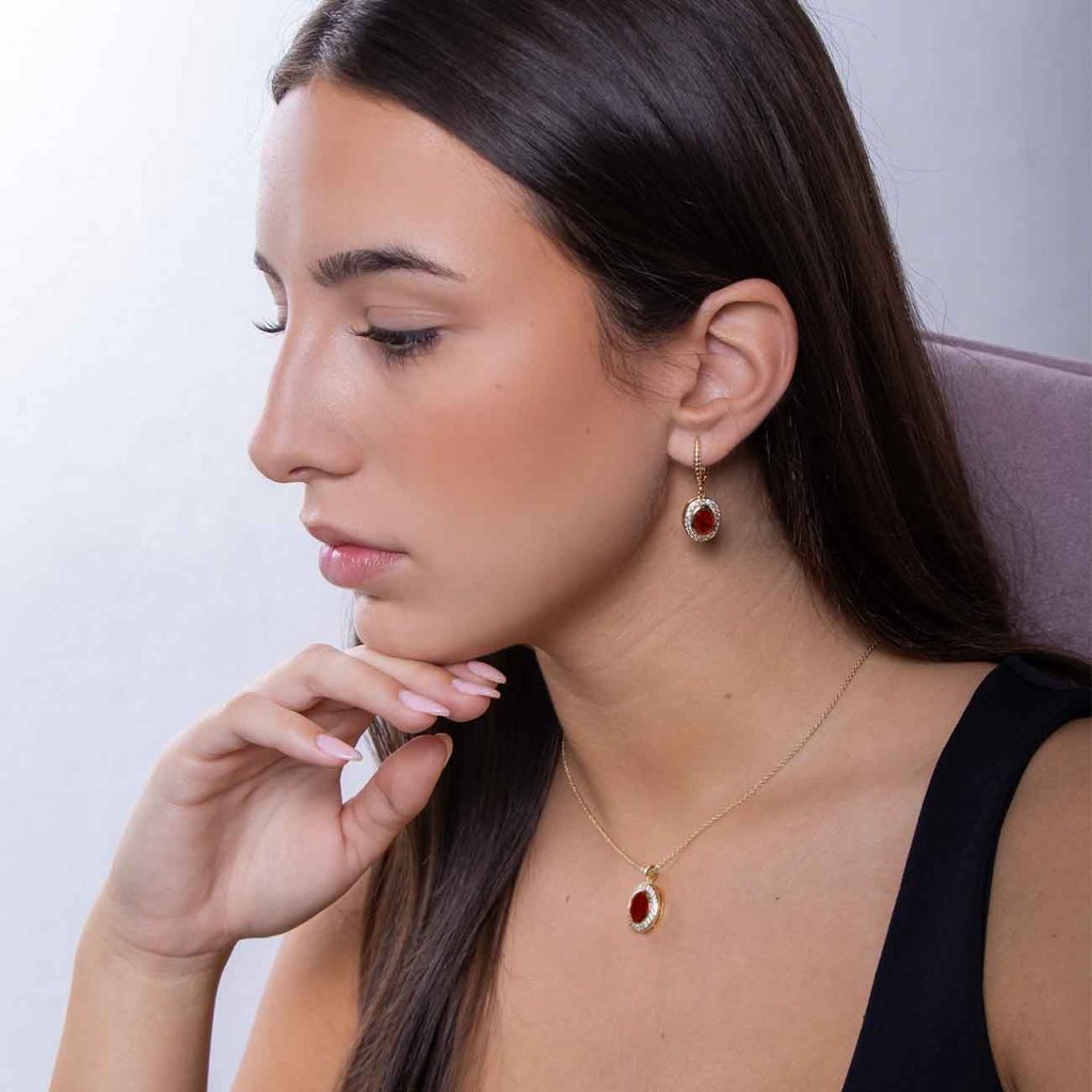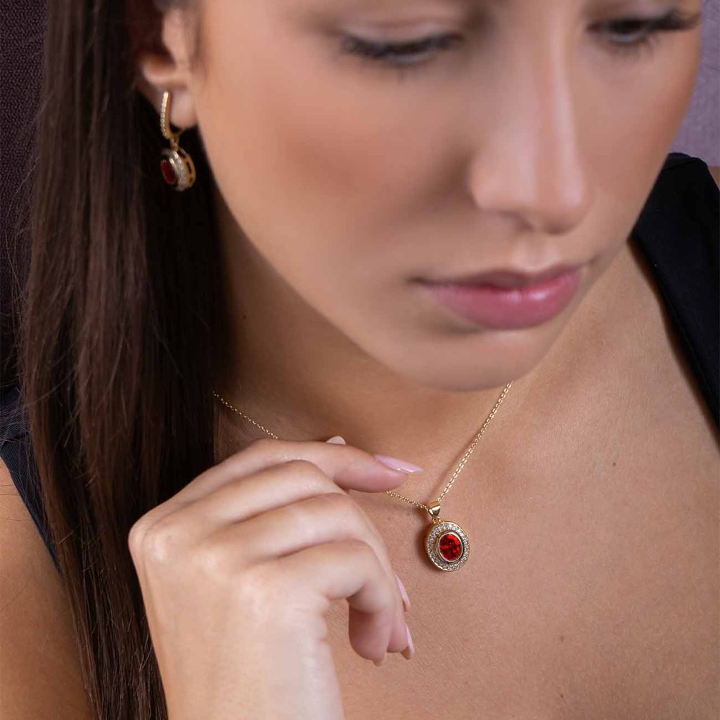 Ez a lenyűgöző fülbevaló és nyaklánc szett egy mélyvörös, ovális kristállyal hívja fel magára a figyelmet, amely ékszer tüzes szíveként hat. Körülötte finoman csillognak az apró, tiszta cirkónia kövek, amelyek kiemelik a kristály élénk színét és szikrát adnak az egész kompozíciónak. Kiváló választás esti eseményekre vagy szenvedélyes ajándéknak.