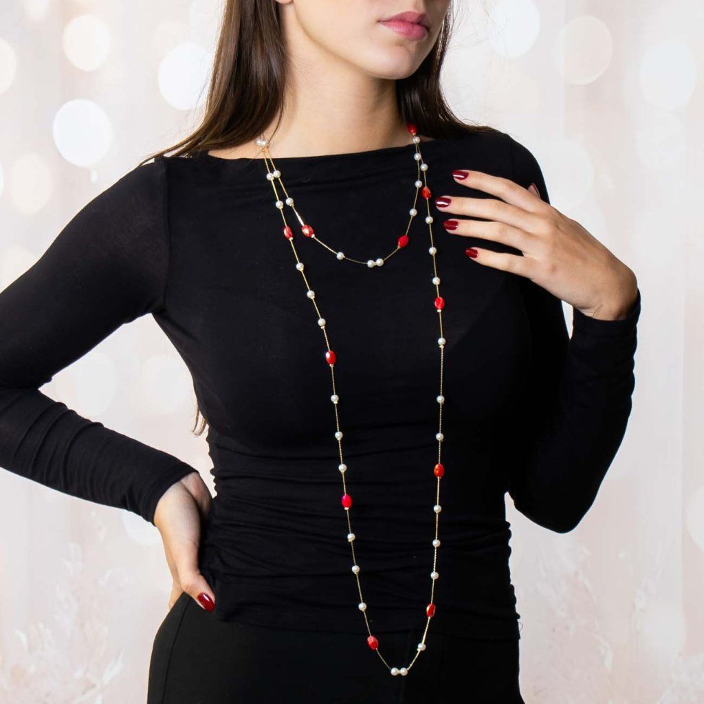 Finom, mégis szemet gyönyörködtető hosszú nyaklánc arany színű lánc, fehér, fényes gyöngyök és feltűnő, fukszia színű csiszolt kövek kombinációjával. Romantikus megjelenése és finom eleganciája ideális kiegészítővé teszi ruhákhoz, blúzokhoz és egyszerű felsőkhöz egyaránt.