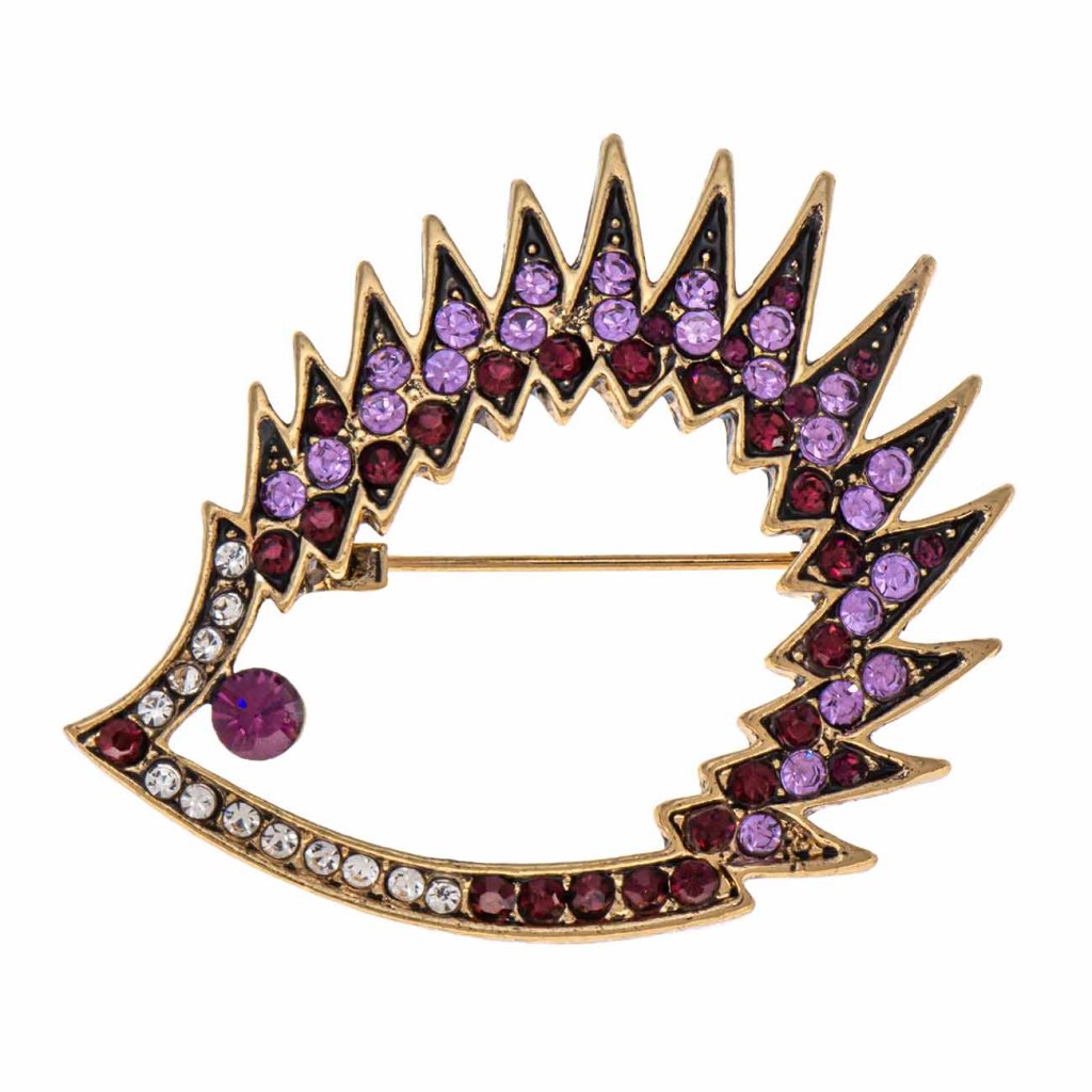 Az egyedi, sün motívummal díszített, lila, bordó és áttetsző kövekkel kirakott bross eleganciájával és finoman extravagáns stílusával tűnik ki. Az arany alap és a fekete vonalak luxus hatást kölcsönöznek az ékszernek.