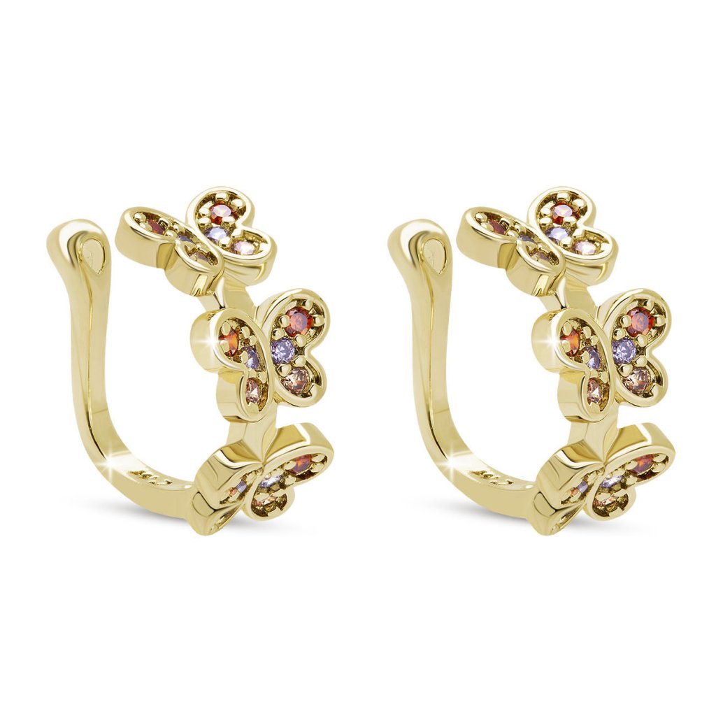 Bájos és játékos fülbevalók finom, romantikus érintéssel. A három plasztikus, apró színes kövekkel díszített pillangó a mozgás és a könnyedség hatását kelti. Formájának köszönhetően a fülbevalók elegánsan beakadnak a fülcimpába, és szépen tapadnak a fülhöz – nincs szükség átszúrásra.