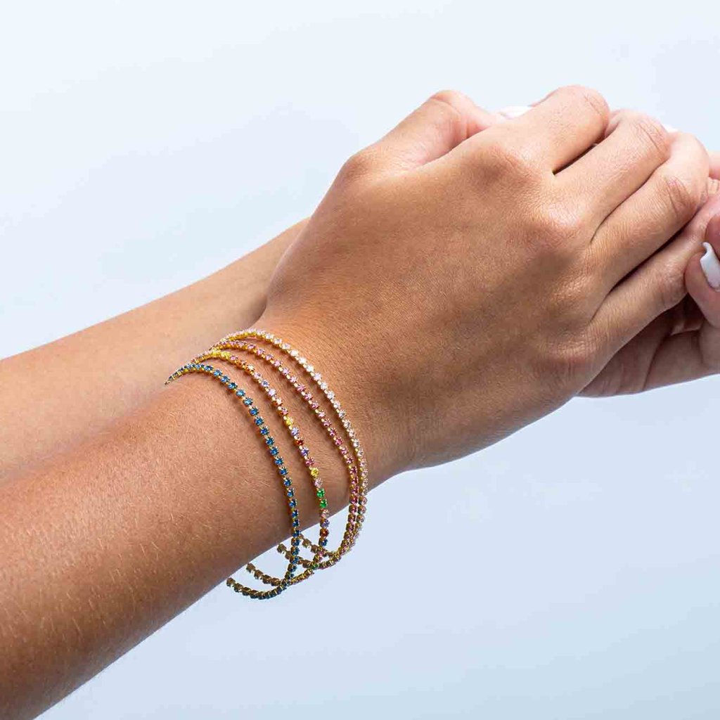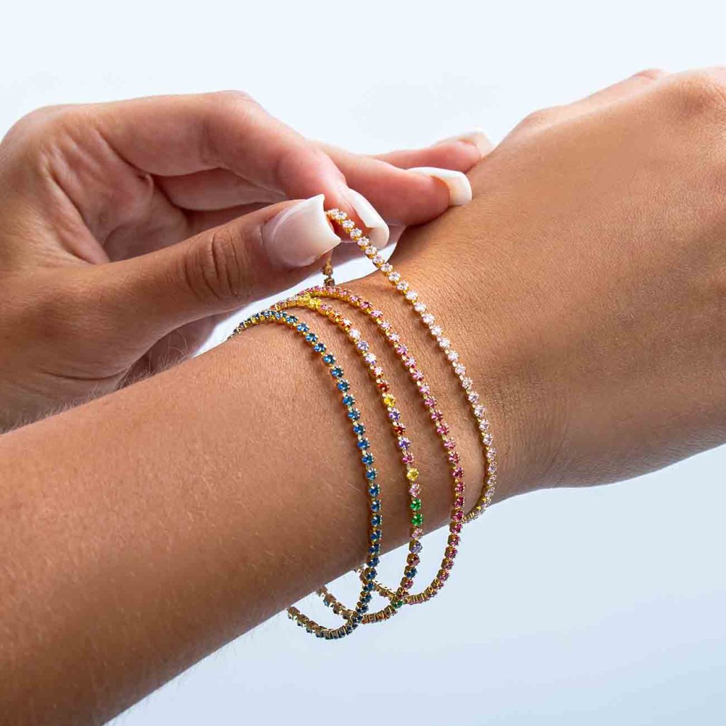 A finom és elegáns tenisz karkötő rózsaszín cirkónia kövekkel nagyszerű kiegészítő a mindennapi viselethez és az ünnepi alkalmakhoz. A karkötő ródiumozott fémből készült, és 14 karátos arannyal van bevonva, ami luxus fényt kölcsönöz neki, és egyben védi a kopástól.