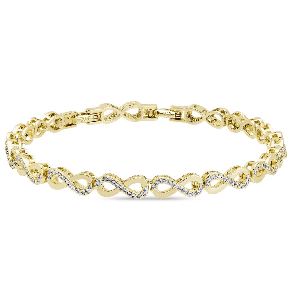 Időtálló karkötő fekvő nyolcas motívummal – a végtelenség szimbóluma – elegáns üzenetet és finom fényt hordoz magában. A szemeket tiszta cirkóniák díszítik, amelyek kiemelik az ékszer luxus megjelenését. Készült ródiumozott fémből és 14 karátos arannyal bevonva, ideális mélyebb jelentésű ajándékként.