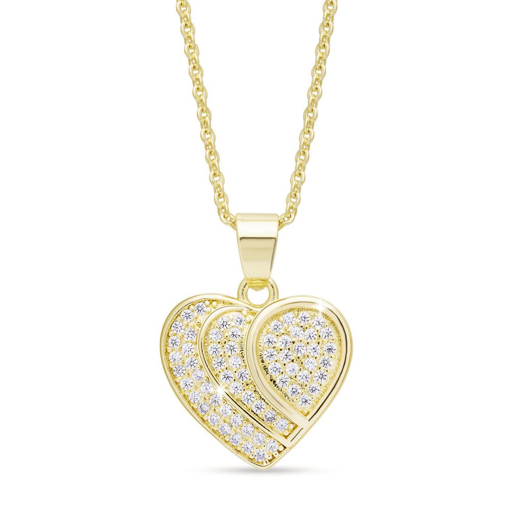 Romantikus nyaklánc dupla szív alakú medállal, amely elbűvölő részletgazdagságával és gazdag csillogásával nyűgöz le. Mindkét szívet tiszta cirkónia kövek díszítik, amelyek luxus megjelenést kölcsönöznek az ékszernek. A felület 14 karátos arannyal van bevonva és ródiumozással kezelve a nagyobb tartósság érdekében.