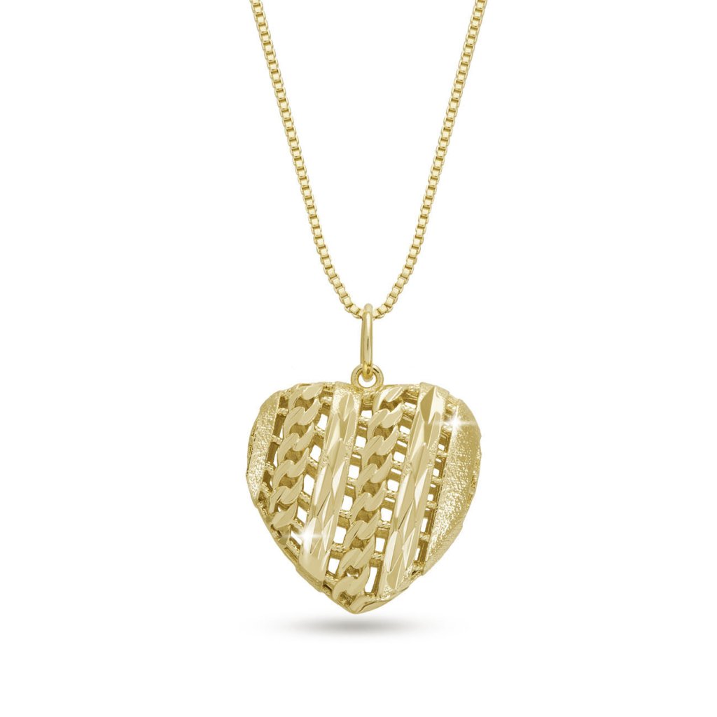 Elegáns, 14 karátos arannyal bevont nyaklánc domború szív alakú medállal, feltűnő és fényűző megjelenést kölcsönöz.