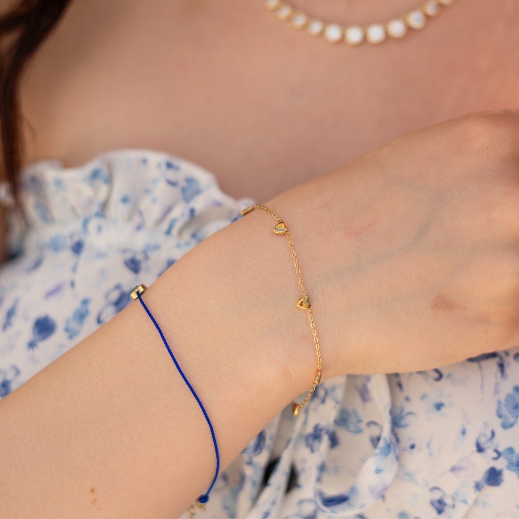 Finom, aranyozott karkötő 3 mm-es szívecskékkel. Diszkréten kiegészíti megjelenését, alkalmas mindennapi viseletre. Pattintós záródás.