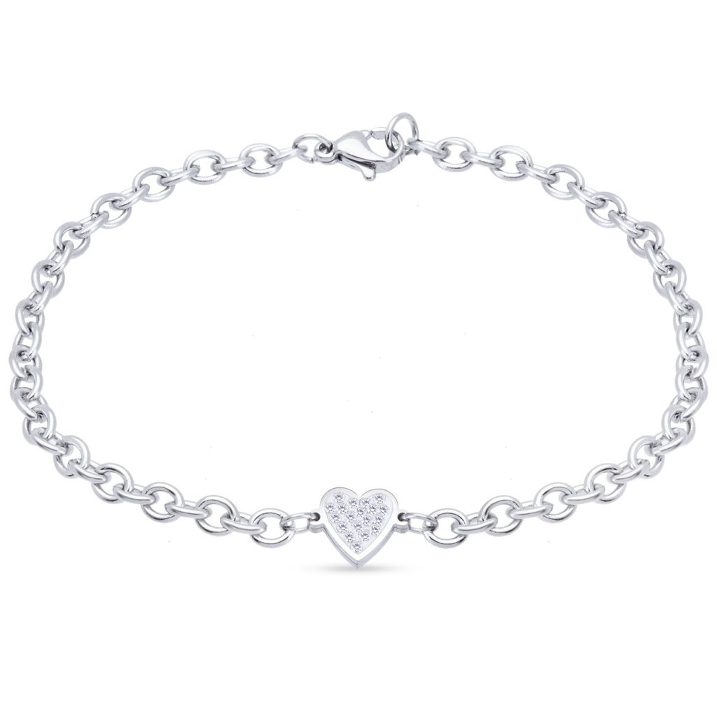 A finom, láncos karkötő, melyet egy áttetsző kövekkel díszített, diszkrét szív tesz teljessé, az elegancia és a romantika megtestesítője. A minimalista design a fényes felülettel kombinálva tiszta, gyengéd és univerzális hatást kelt – mindennapi viseletre és különleges alkalmakra egyaránt.