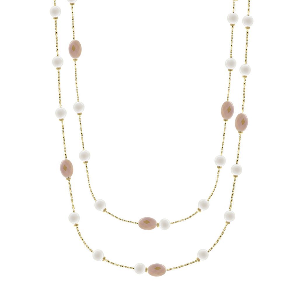 Az elegáns, kétsoros nyaklánc, melyet fehér gyöngyök és rózsaszín, ovális gyöngyök kombinációja díszít, finom és ötletes hatást kelt. A finom szemű, aranyozott lánc luxust és nőiességet kölcsönöz az ékszernek. Ideális rétegezéshez és önálló, feltűnő kiegészítőként is. Tökéletesen illik a hétköznapi öltözékekhez és az ünnepi alkalmakhoz is.