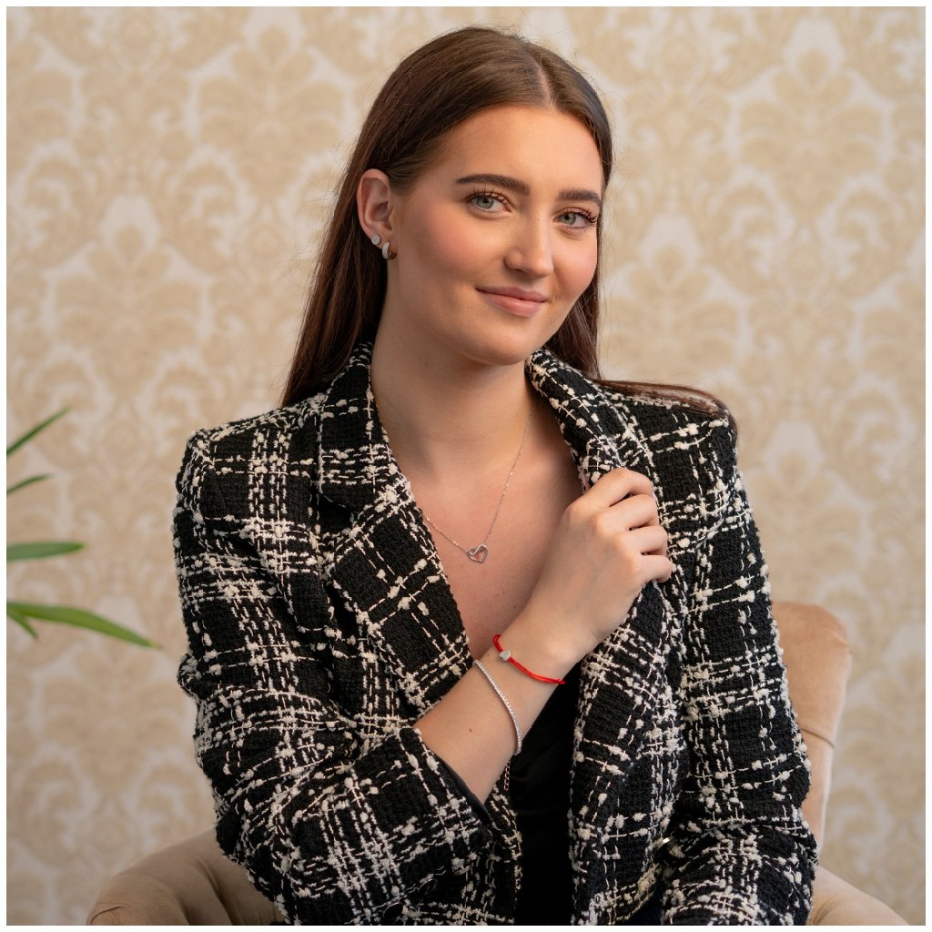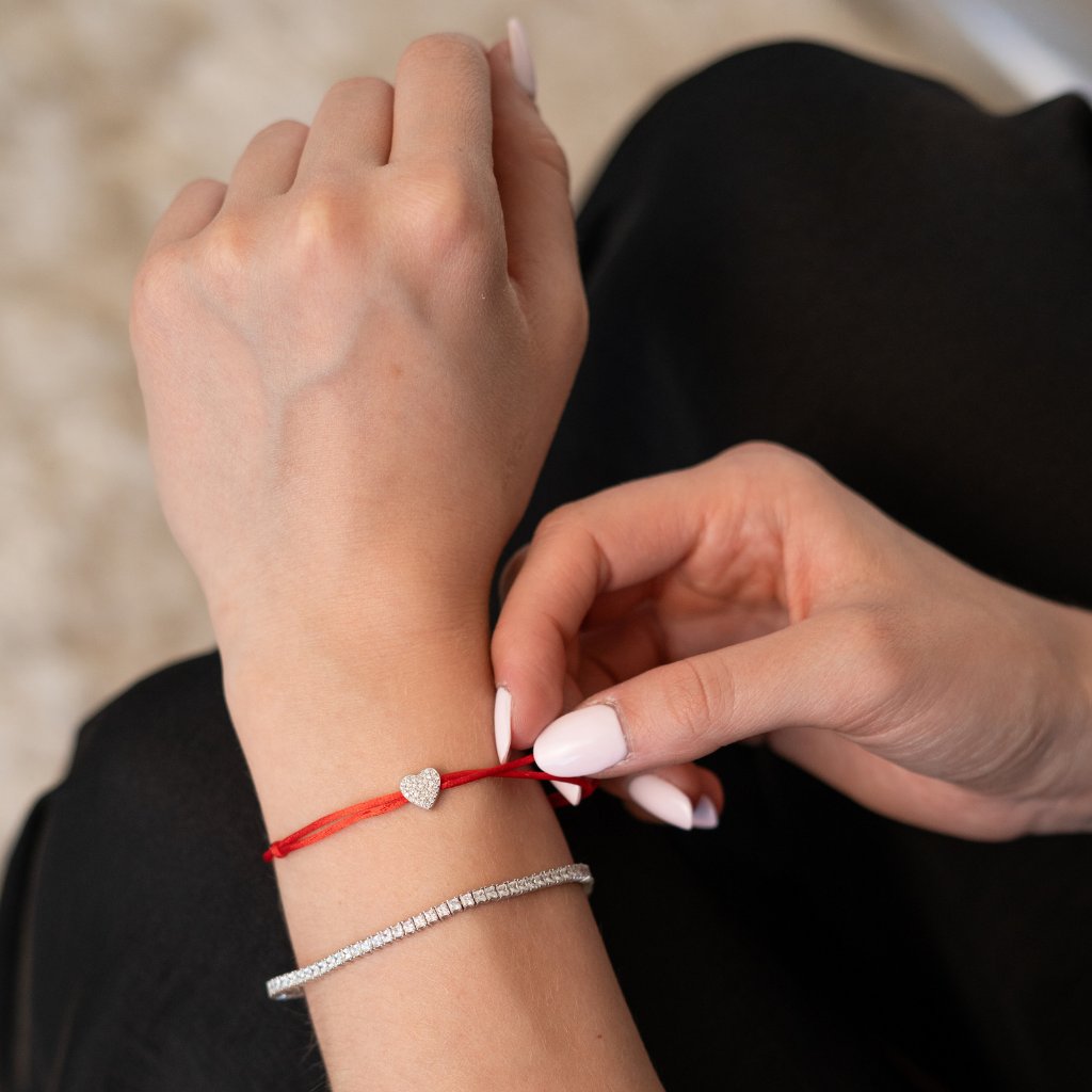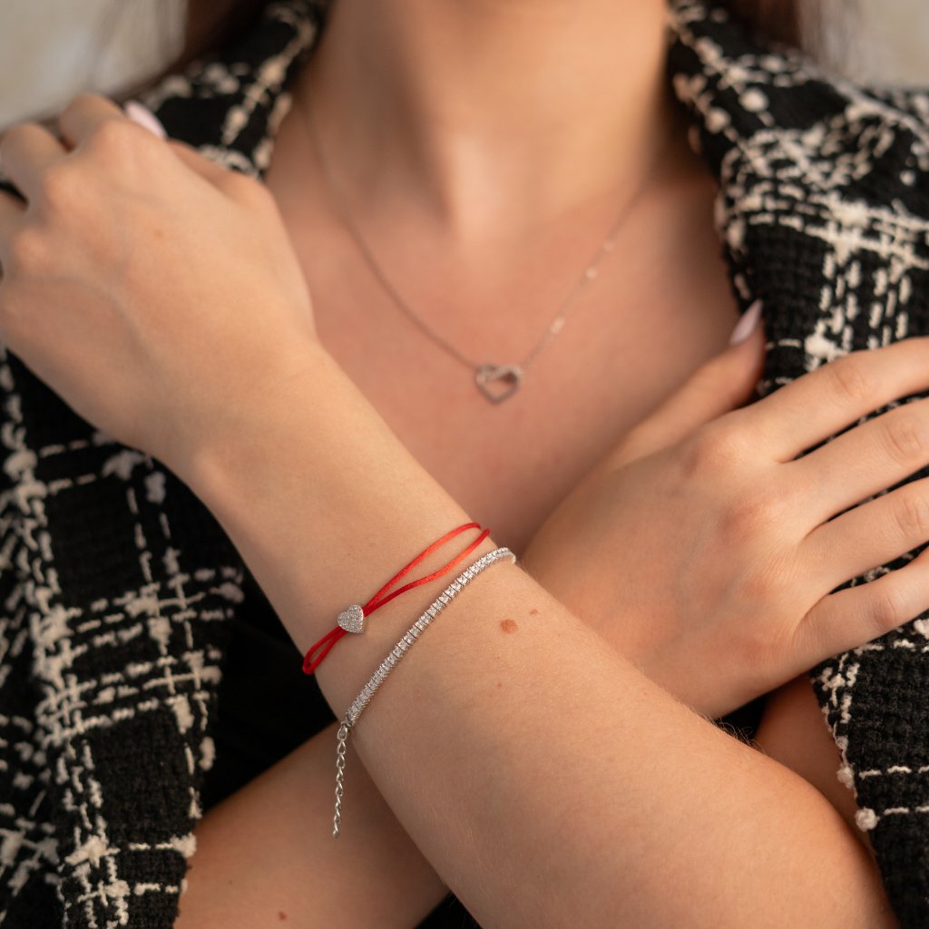 Minimalista, mégis különleges – ez a kézzel kötött karkötő egy piros textilzsinóron finom, szív alakú, Ag 925/1000 ezüstből készült, csillogó cirkónium kövekkel díszített medált visel. A szív szimbóluma a szeretetet, a gyengédséget és a barátságot fejezi ki, míg a piros zsinór színe hagyományosan a védelemmel és a pozitív energia erejével kapcsolódik össze.