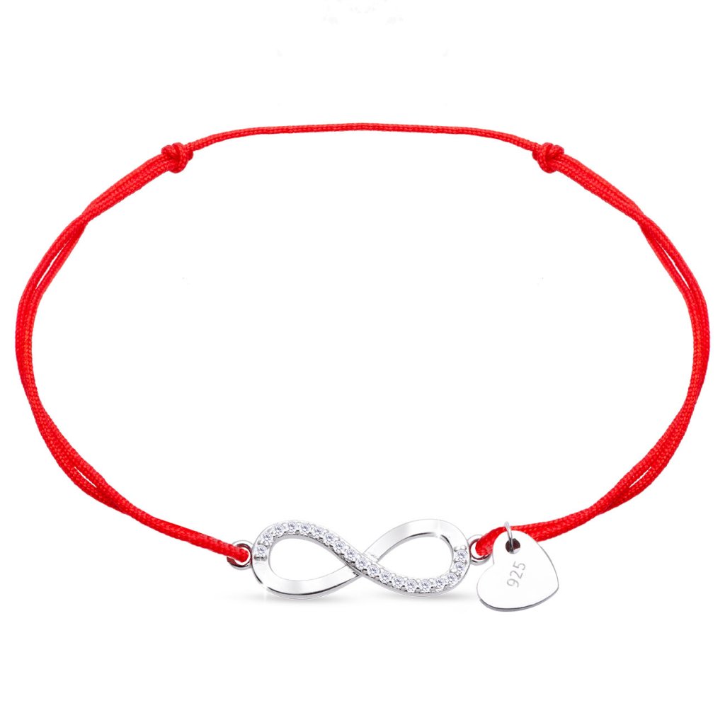 A végtelen szerelem, barátság és energia szimbóluma – ez az elegáns karkötő egy feltűnő piros textilzsinórt kombinál egy fényes, végtelen szimbólummal, amely Ag 925/1000 ezüstből készült, és csillogó, tiszta cirkóniákkal van kirakva.