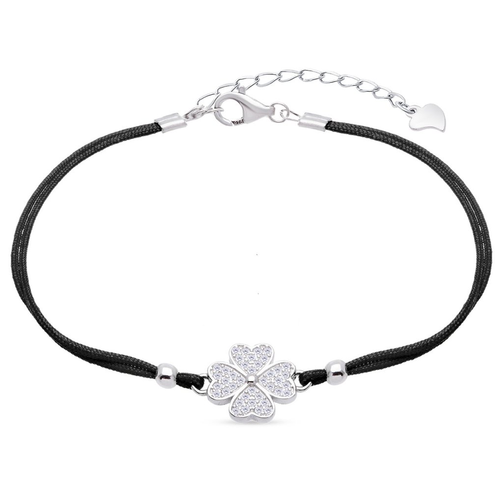 Stílusos szerencsehozó talizmán – ez a fekete textilzsinórból készült karkötőt ragyogó, apró szívekből álló négylevelű lóhere díszíti, melyeket csillogó, tiszta cirkóniák ékesítenek. A középső elem Ag 925/1000 ezüstből készült, ami garantálja a minőséget és az eleganciát.